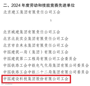 近日,北京市建筑工会发布《关于2024年首都建筑工匠、劳动和技能竞赛优秀组织单位、先进单位的通报》,中国建设科技集团股份有限公司工会荣获2024年度劳动和技能竞赛先进单位。