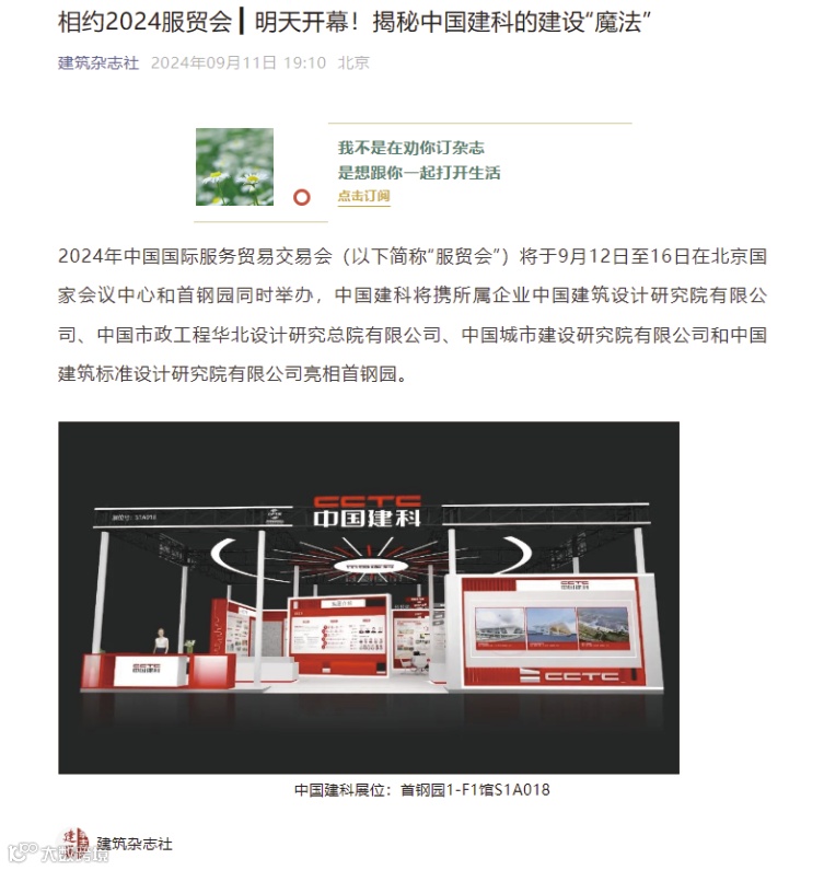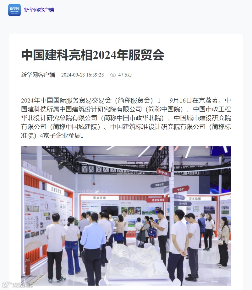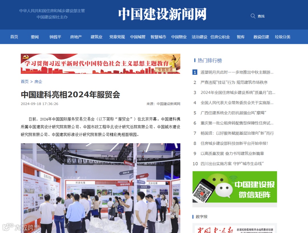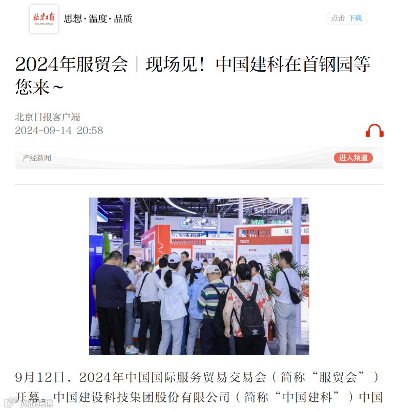 2024年9月12日至16日,中国国际服务贸易交易会(简称服贸会)在京成功举办。中国建科精彩亮相首钢园展区,围绕科技赋能美好生活,聚焦自身技术和产品的创新优势,展示装配式内装、空气检测、适老化改造、生态环境与城市水系统等领域的创新成果,吸引新华网、北京日报、新京报、中国经济新闻网、中国建设新闻网和建筑杂志社等多家媒体采访报道。