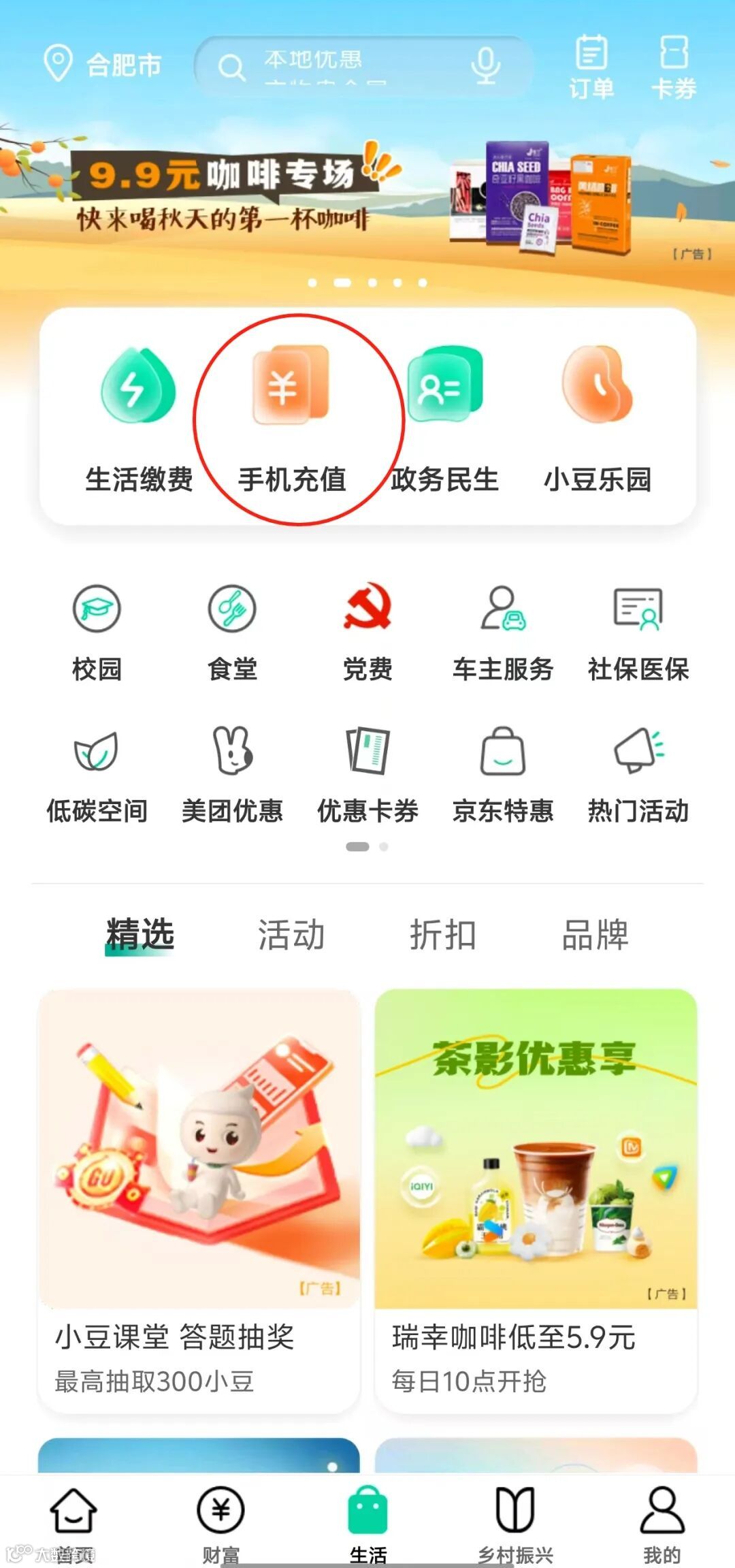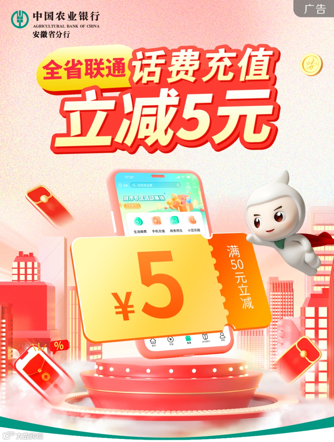 活动期间,客户使用安徽农行掌银APP,在“生活-手机充值”页面,缴纳联通手机费(不含携号转网手机号),享受满50元立减5元优惠。每人每月限享1次优惠名额,数量有限,先付先享,用完为止。