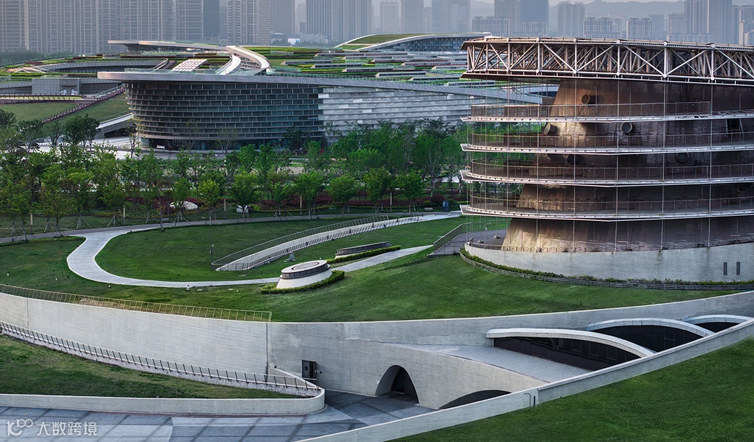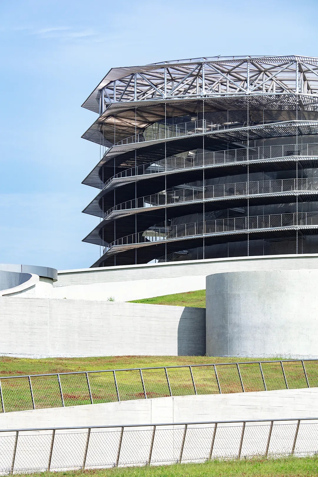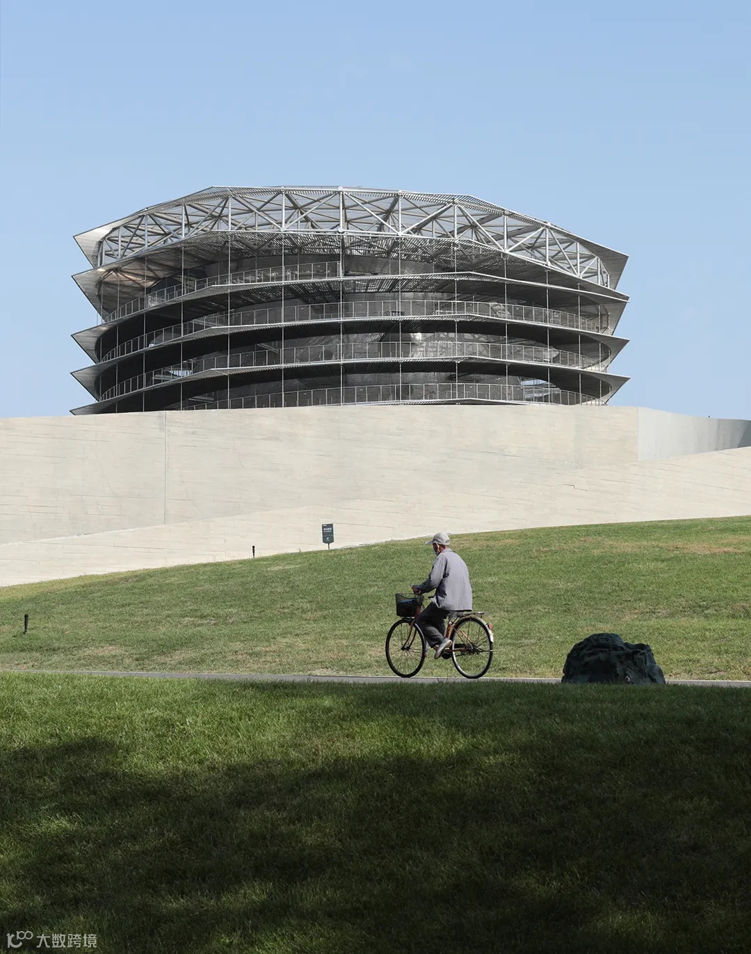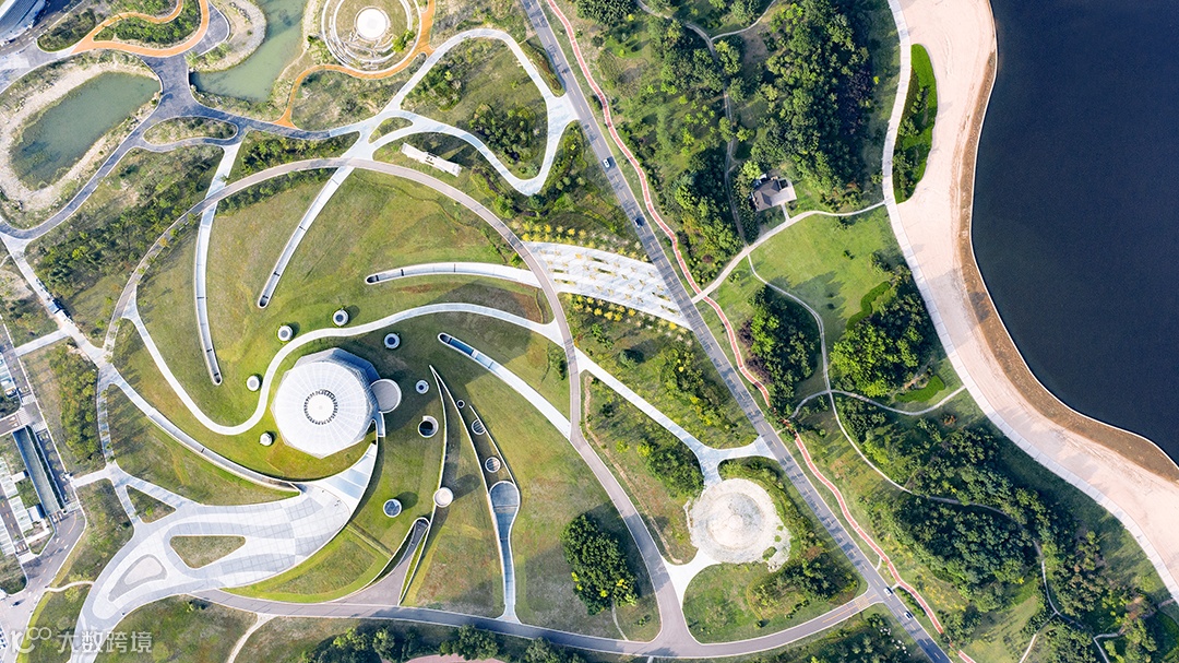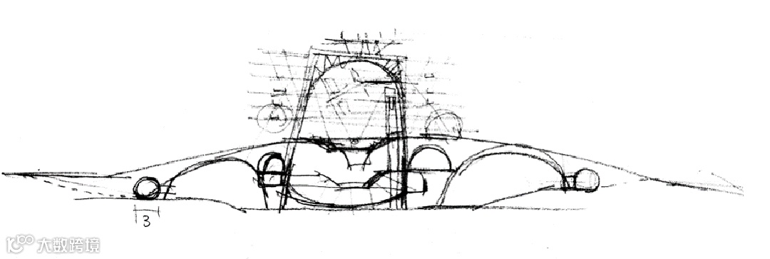 串联展厅的通道甩出长长的轨迹,延伸到整个地面景观中,成为地面景观的主要元素。球幕影厅是整个科技馆唯一露出地表的构筑物,它象征着一个巨大的AMS带着微小的倾角置于草坡之上,成为整个滨水公园的标志物。这张草图也让人联想起丁肇中教授模拟宇宙形成的L3实验所在地的巨大圆环,也就是欧洲核子研究中心的地下加速器。这个圆环周长27千米,深埋于地下100米。