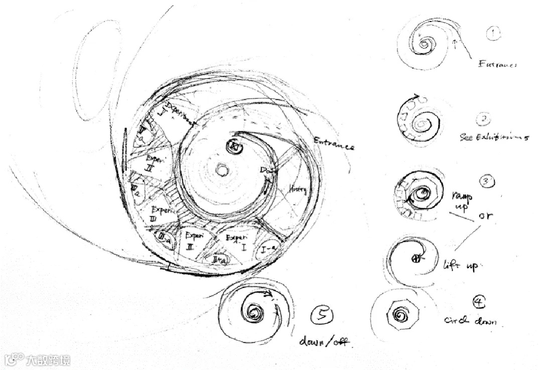 崔愷院士最初的草图尝试将动态的星系运动与五大展厅的布局建立联系,所有展示空间都被置入地下,建筑平面布局的核心如同一个黑洞,五大展厅像星球一般环绕着中心,所有的元素都是动态、向心、内卷的,仿佛最终都将被吸入到黑洞中。