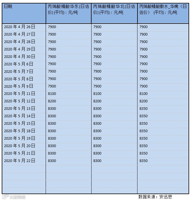 表 2020年4月26日-2020年5月22日中国市场精丙烯酸日估价