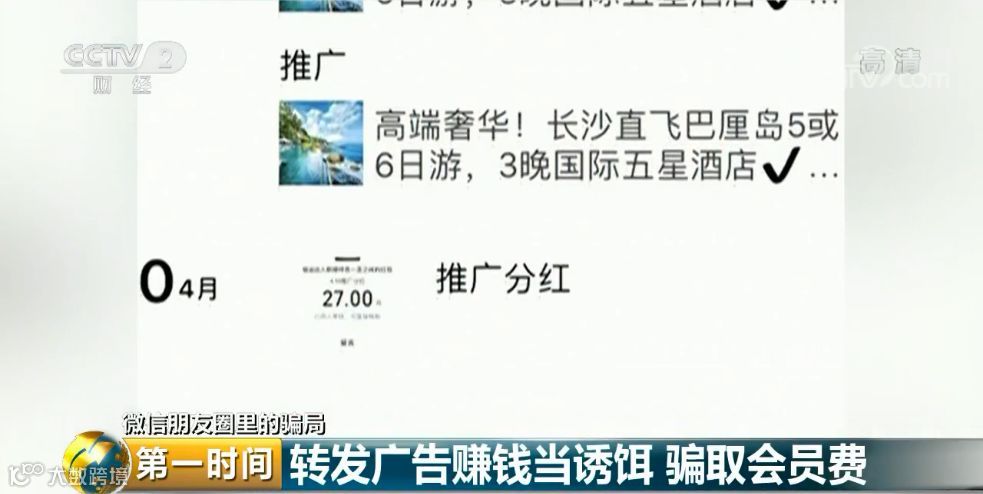 今年2月,杨女士在微信朋友圈中,看到有好友每天会准时发三次旅游广告和一张领取27元红包的手机截图。一打听,朋友说,她是给一家旅游公司做推广,交350元会员费后,每天发三次广告,就能天天领“工资”。