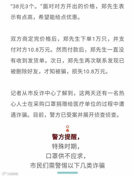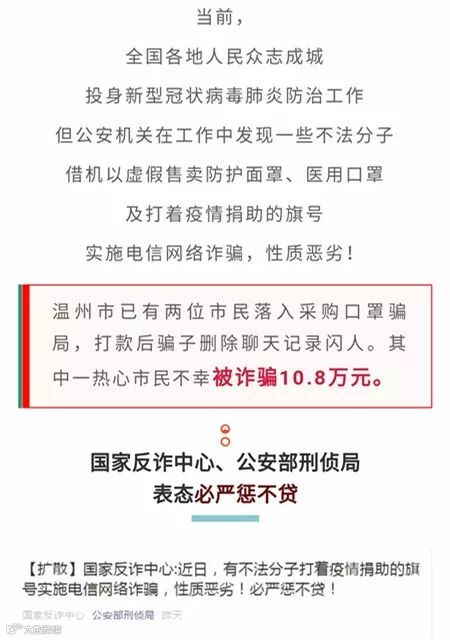 导读:1月27日,温州反诈中心接到一起在微信上兜售医用口罩的诈骗警情,在外经商的郑先生想给家乡捐赠一批医用口罩
