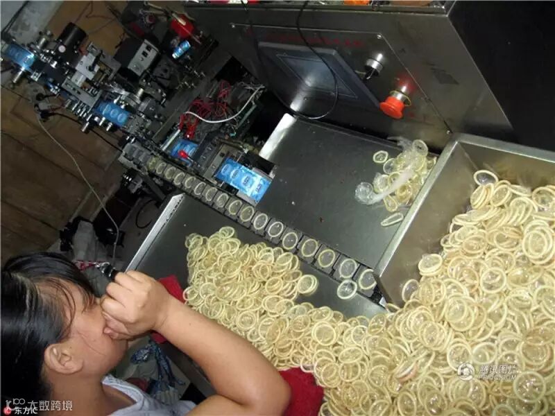 图为警方公布的现场照片,河南、上海等9处加工窝点及仓储窝点已被全部捣毁,共抓获犯罪嫌疑人9名。加工点内,机器设备上堆满了安全套,一名女工正在作业。