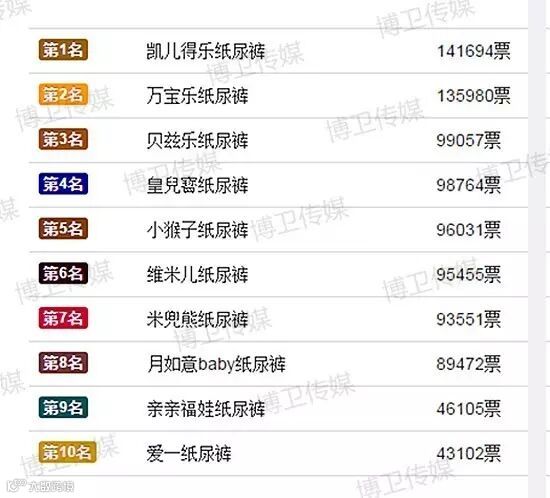 (3) 评选结果将于2017年10月26日在父母频道和博卫传媒微信公众号公布,票数最高的前十位品牌,将获得“2017国内十佳微商纸尿裤/卫生巾品牌”奖项;票数排名十一至二十名品牌,将获得“2017国内具有发展潜力微商纸尿裤/卫生巾品牌”奖项,并由博卫传媒授予奖杯,同时在新华网、新浪网、腾讯网、网易、搜狐网、凤凰网、央视网、今日头条、中国婴童网、中国卫生用品网、博卫传媒微信公众号等主流媒体大力宣传报道。