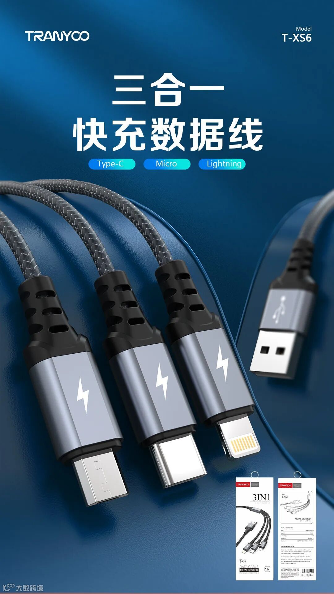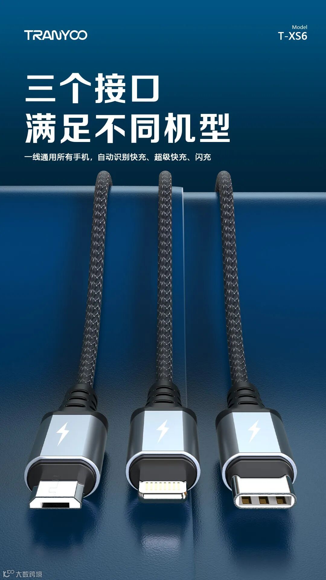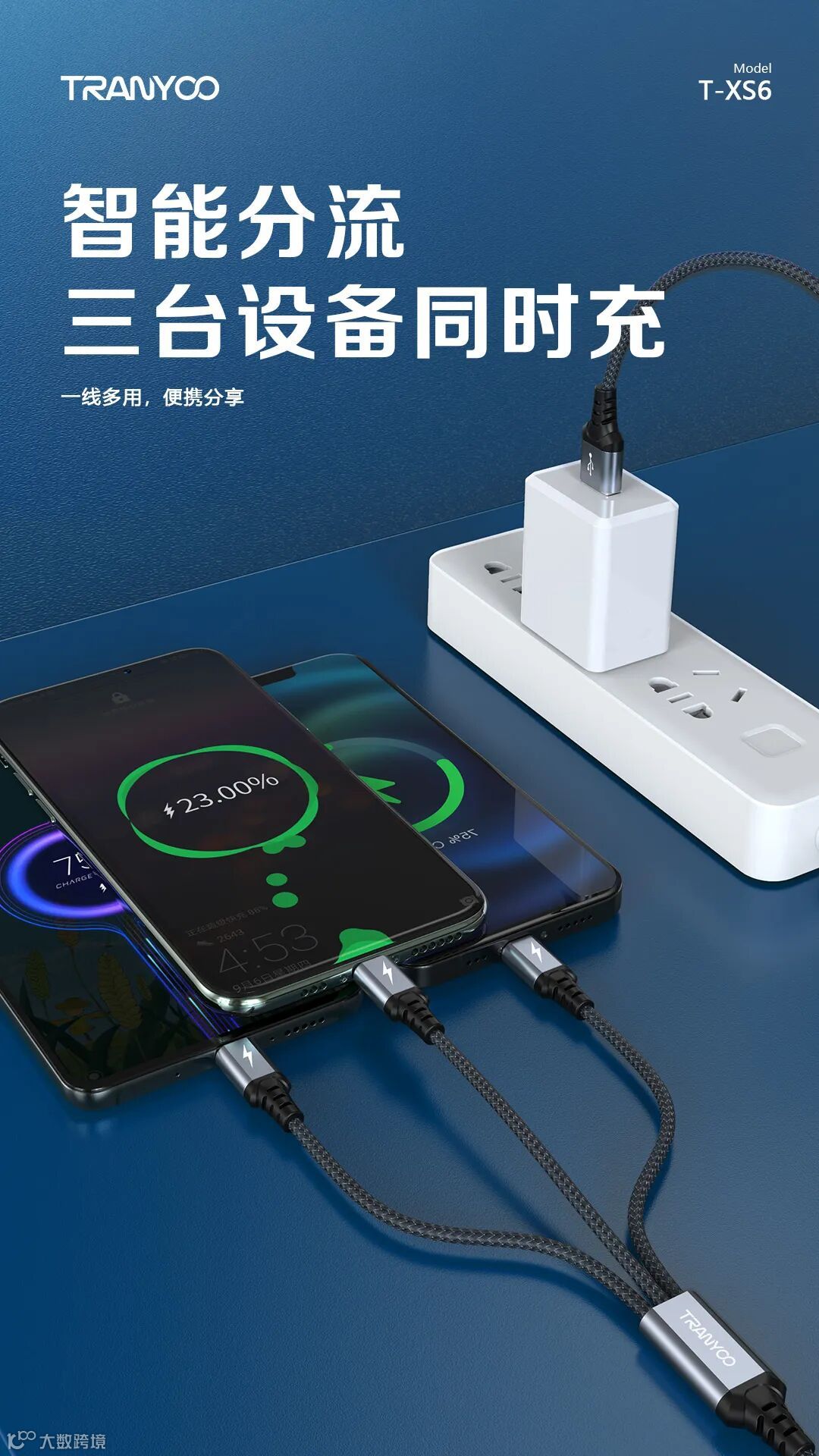 1. 智能分流,同时支持三台设备充电。2. 金属尼龙编织,高颜值,坚固耐用。3. 智能芯片,充电提速不伤机。