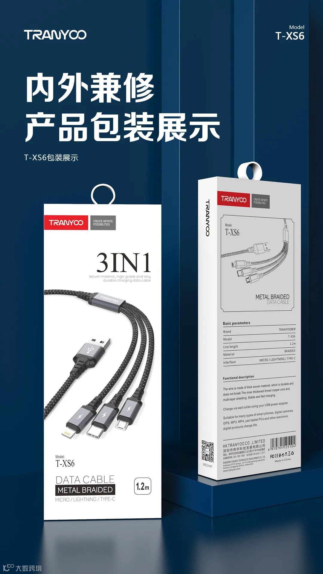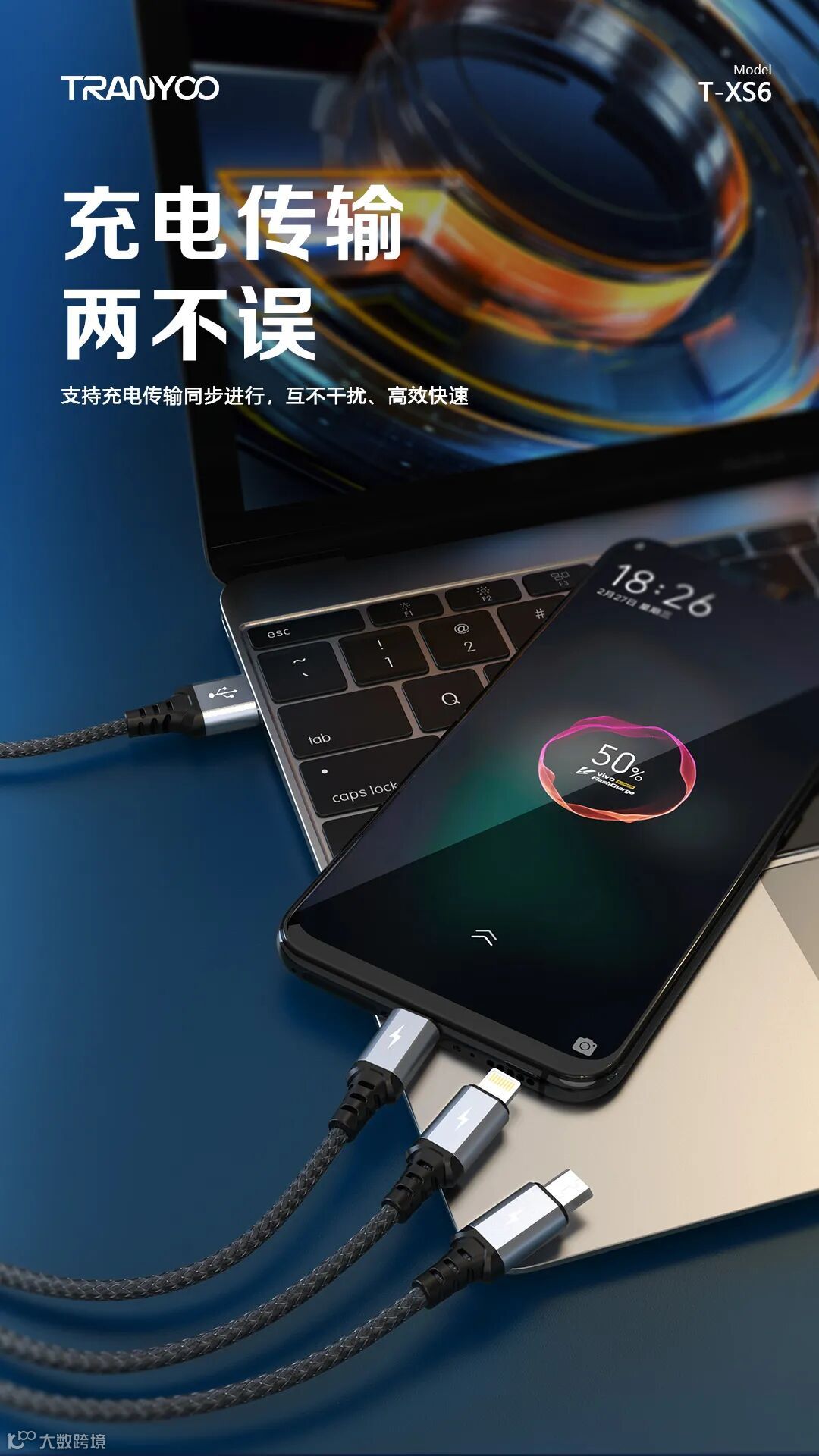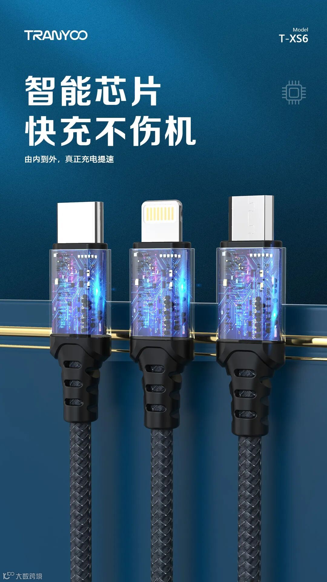 1. 智能分流,同时支持三台设备充电。2. 金属尼龙编织,高颜值,坚固耐用。3. 智能芯片,充电提速不伤机。