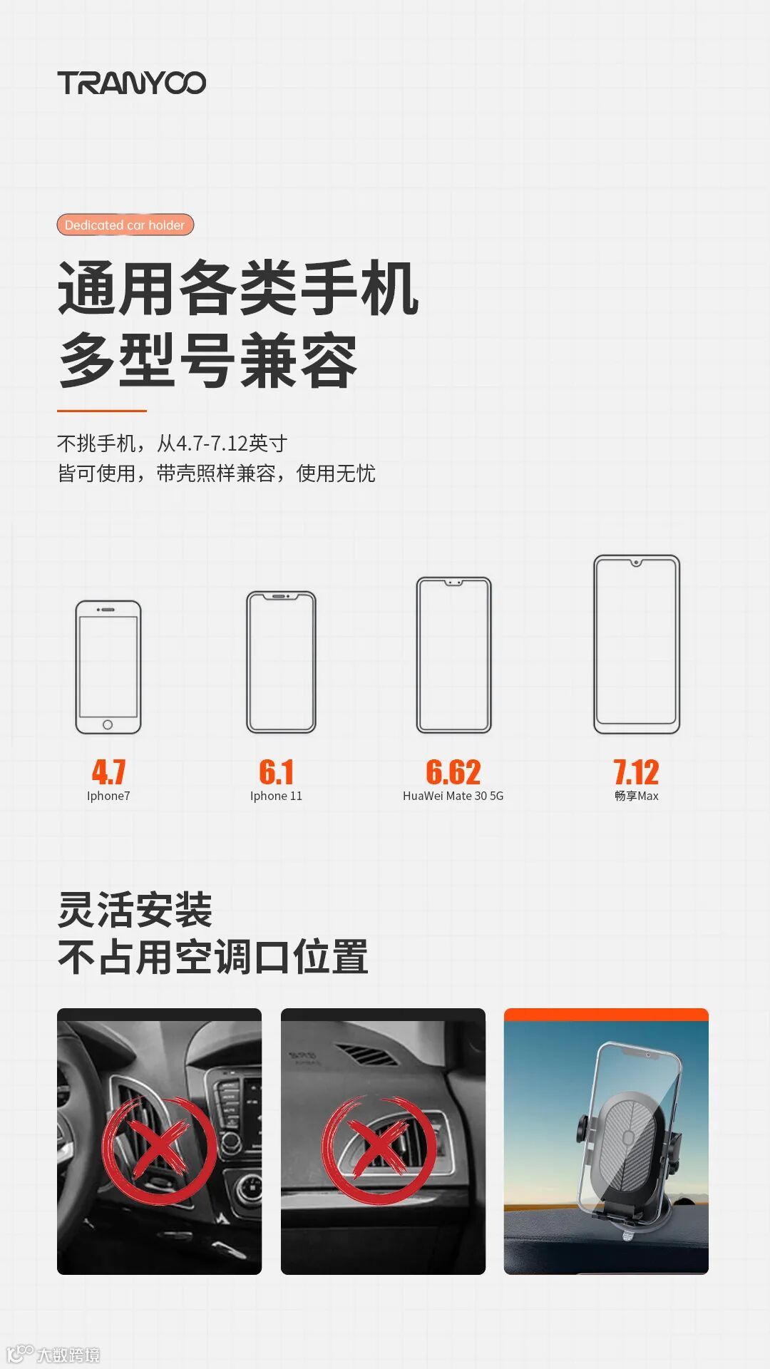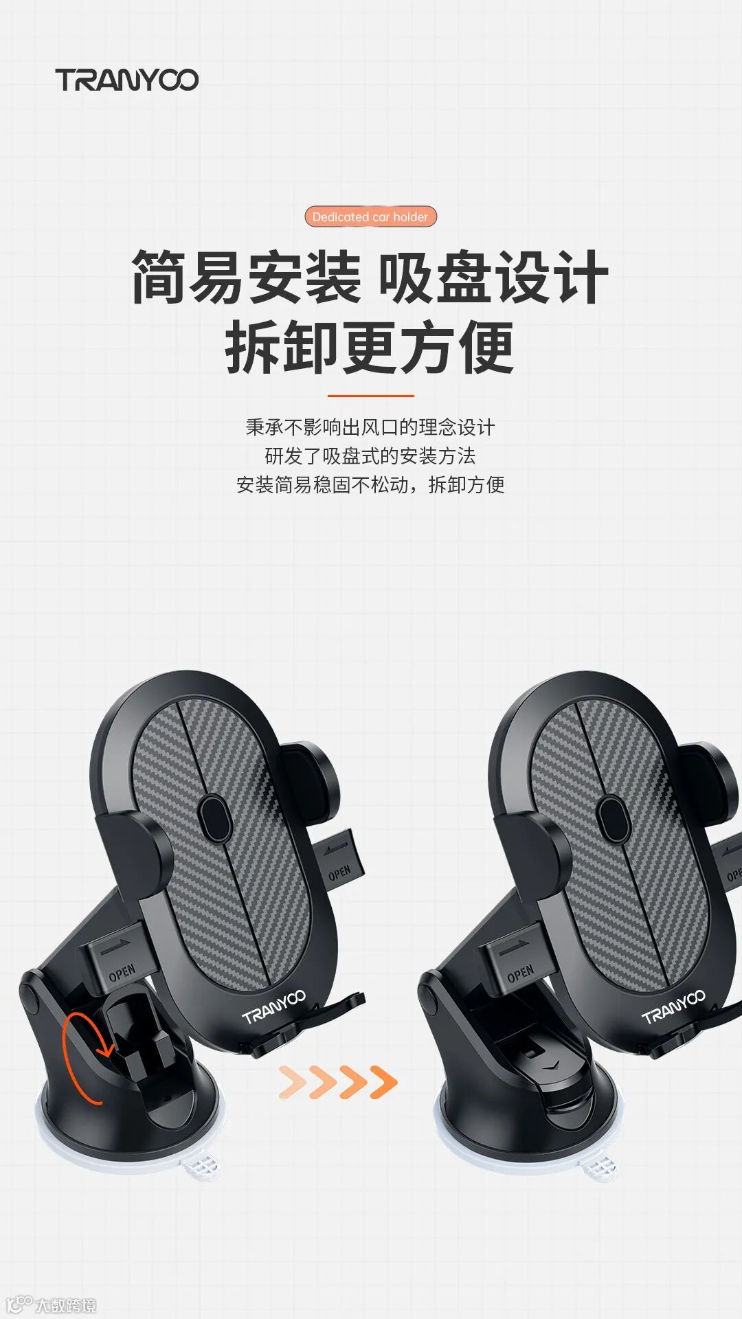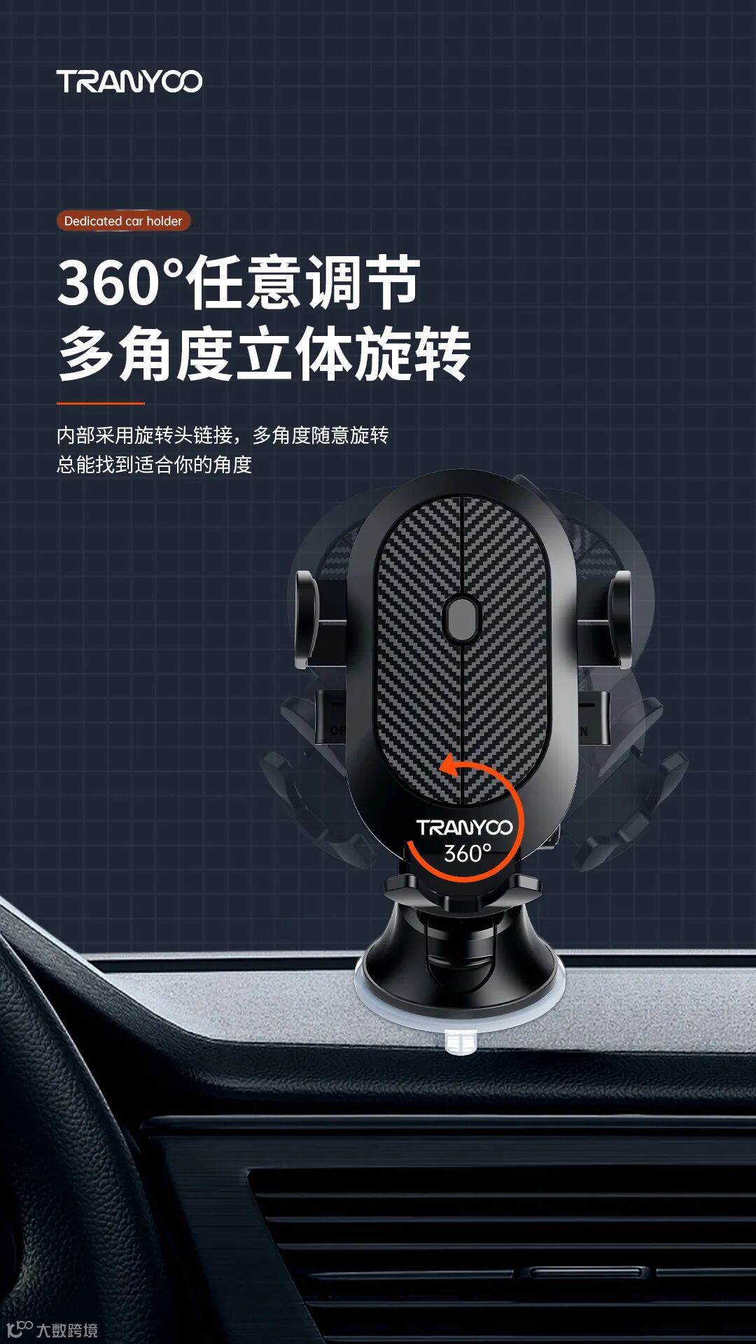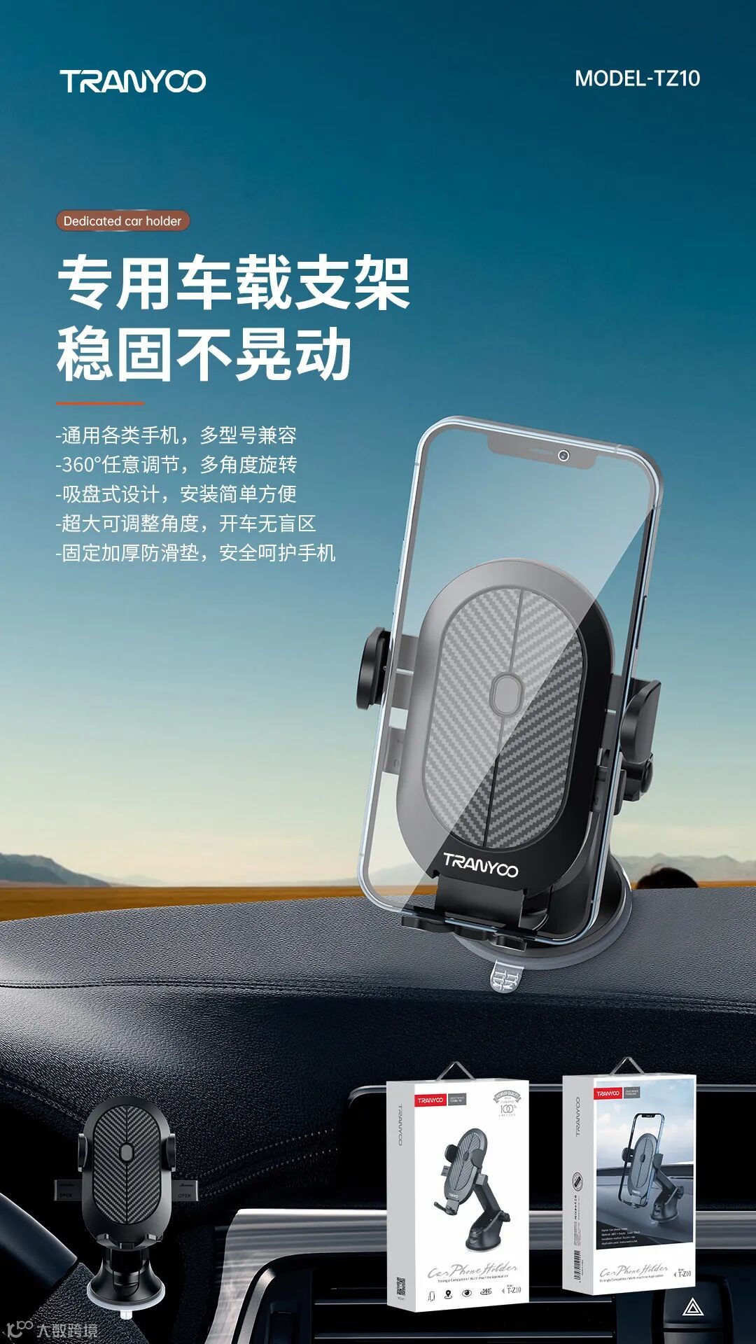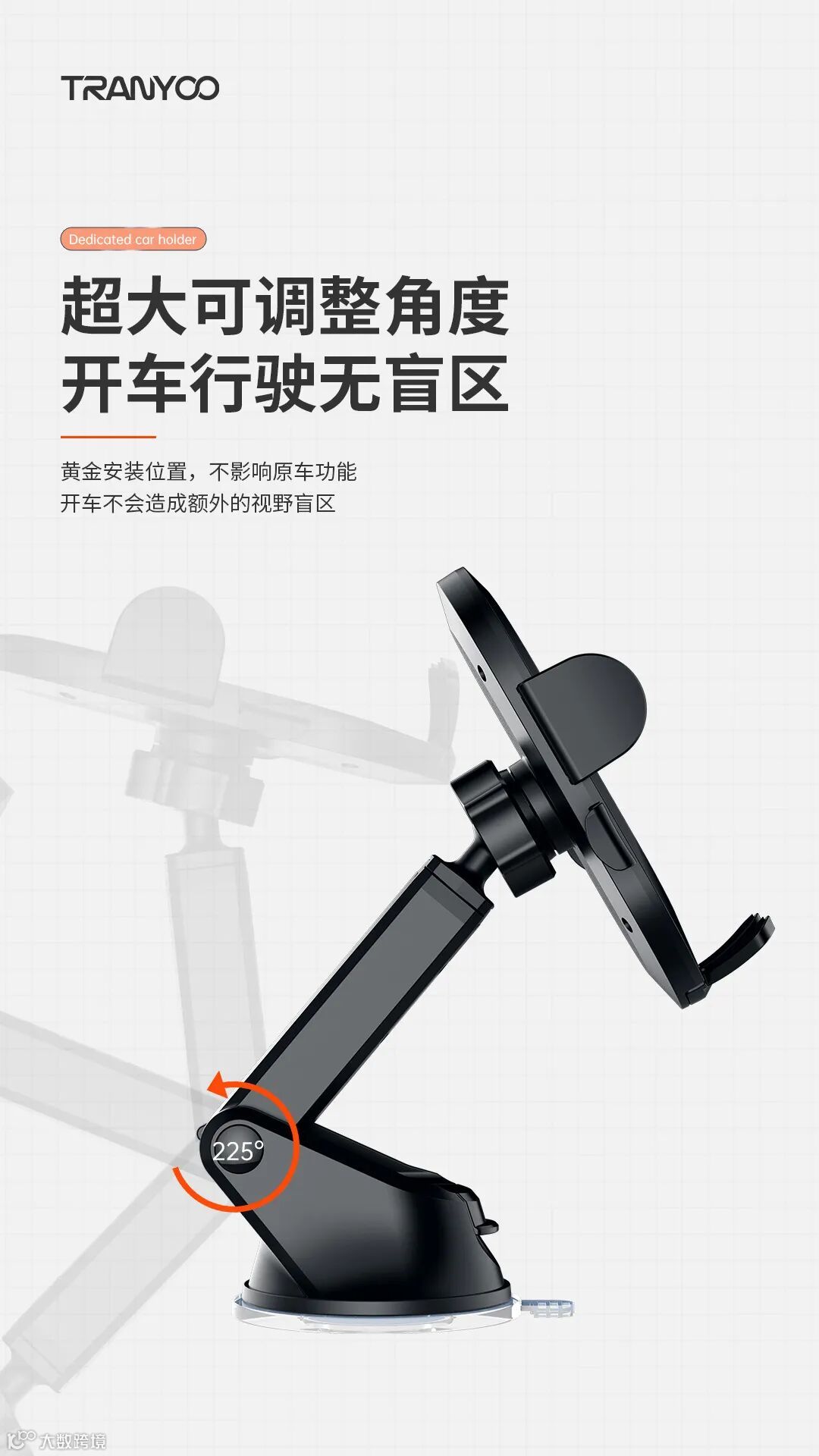 1.支架底部吸盘固定安装方便快捷稳固不脱落。2.可360°旋转调节高度,视野开阔无盲区。3.通用各种型号手机,加厚防滑垫减震,物美价廉品质超好的一款支架。