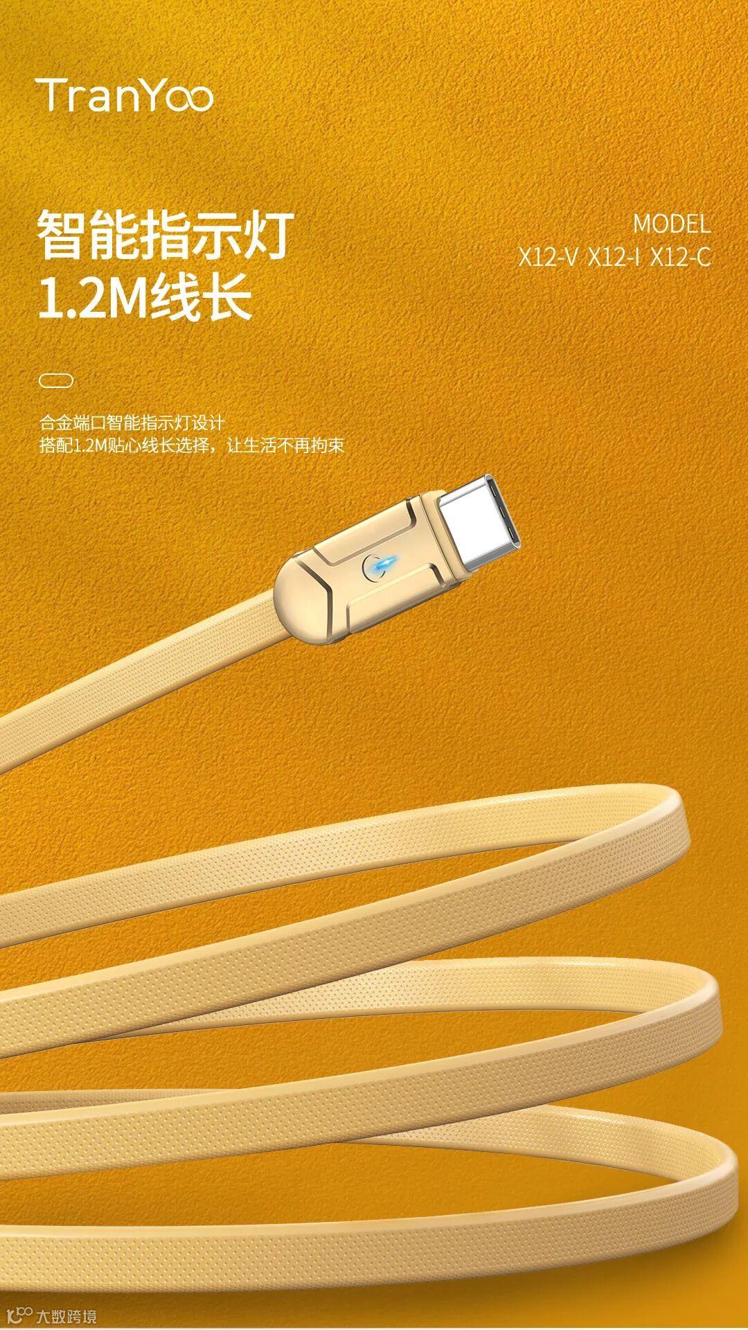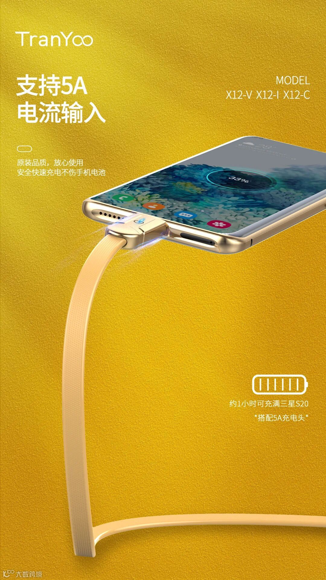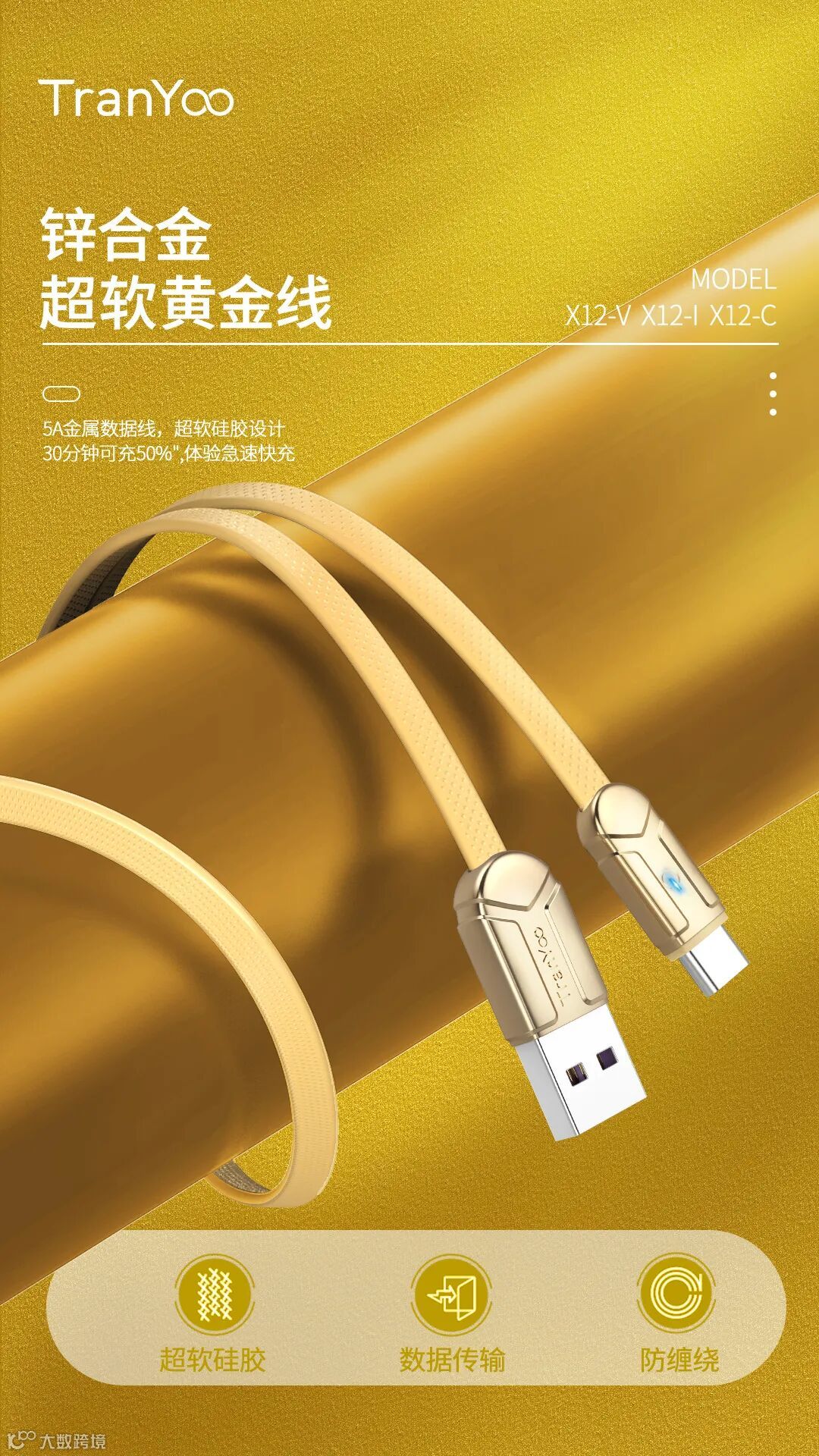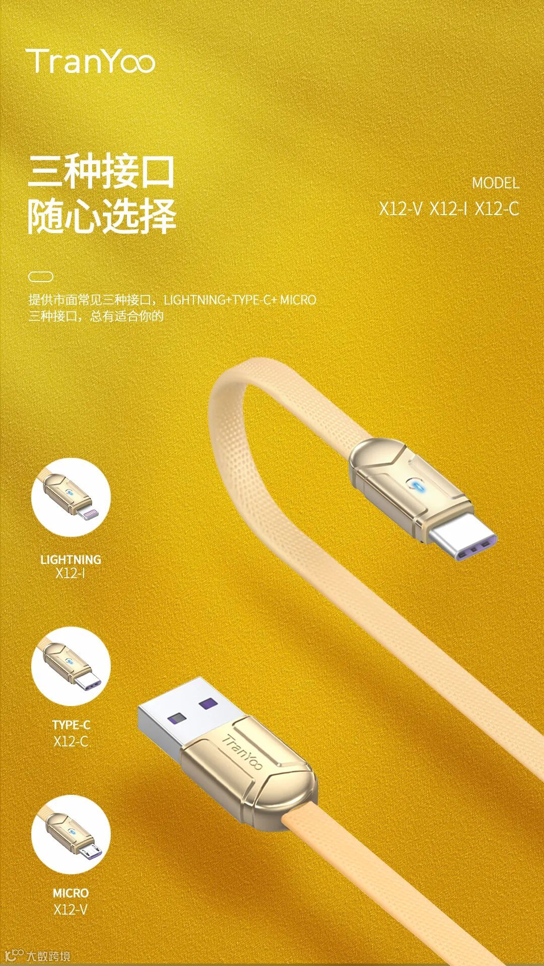 导读:土豪金端口 自带指示灯 | X12 黄金甲带灯5A数据线