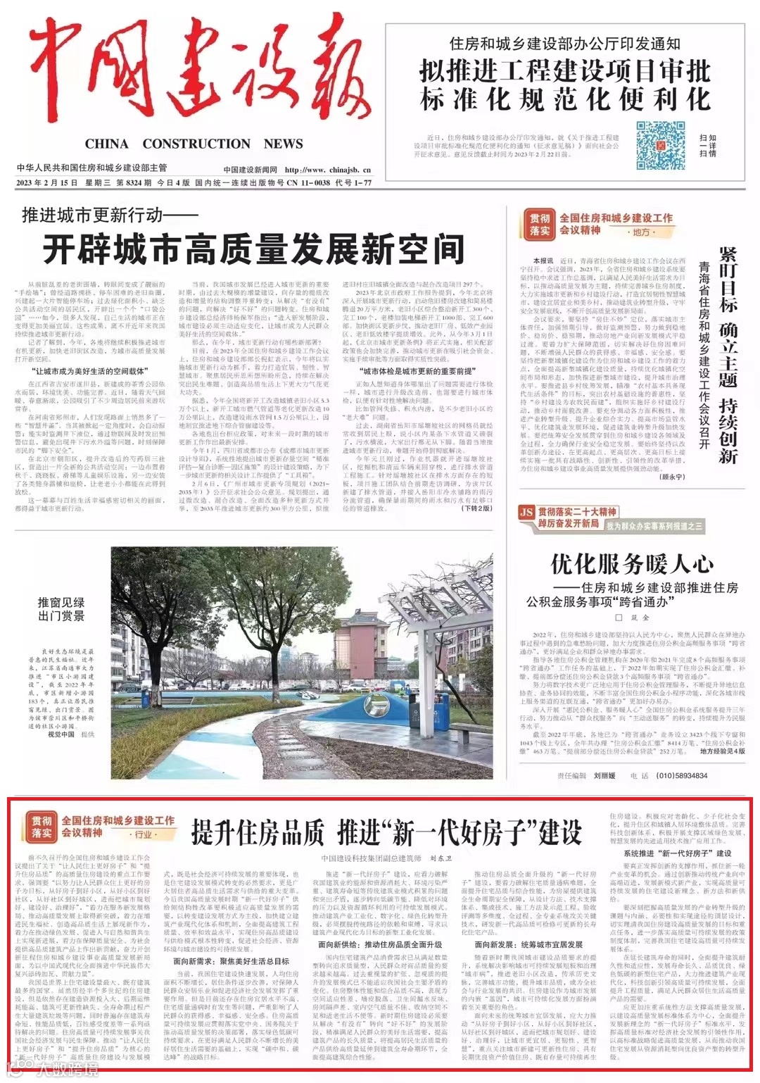 2月15日,《中国建设报》头版刊发中国建设科技集团(简称中国建科)副总建筑师刘东卫题为《提升住房品质 推进“新一代好房子”建设》的文章,提出要推进以建筑产业现代化为目标的新型工业化发展,研发新一代长寿化住宅产品,积极开展绿色智慧的先进适用技术推广应用,用新理念、高标准推动我国住宅发展从资源消耗性向优良资产型的转型升级。