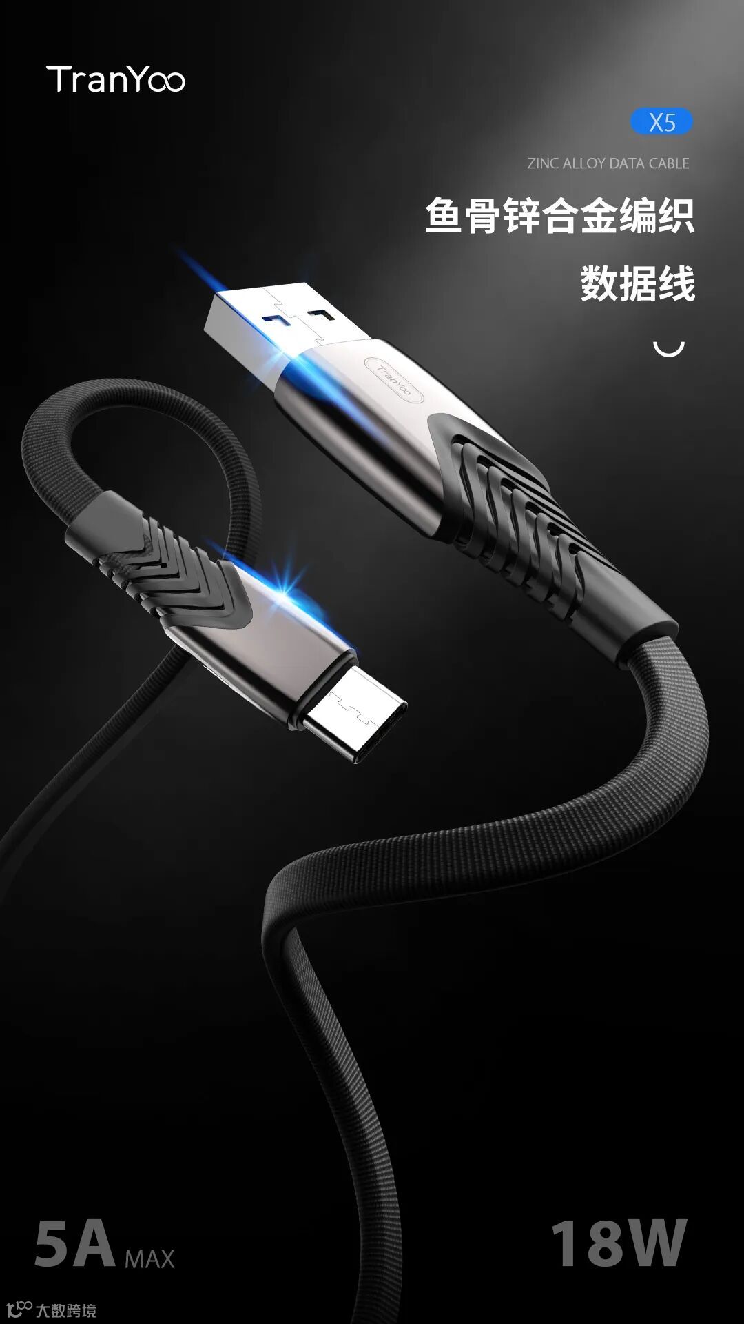 导读:18W快充 耐折弯压不断裂 | X5 鱼骨锌合金编织数据线