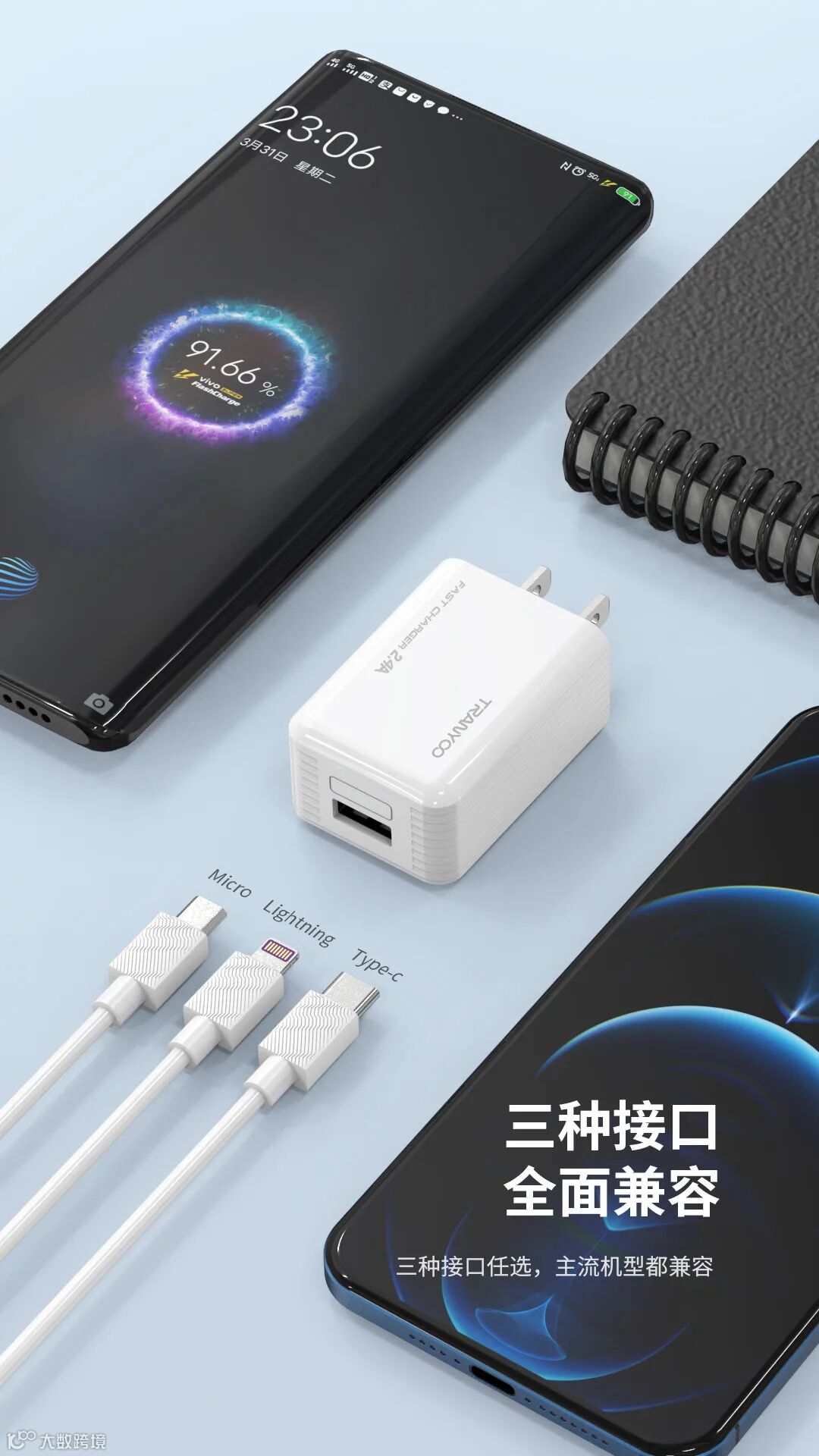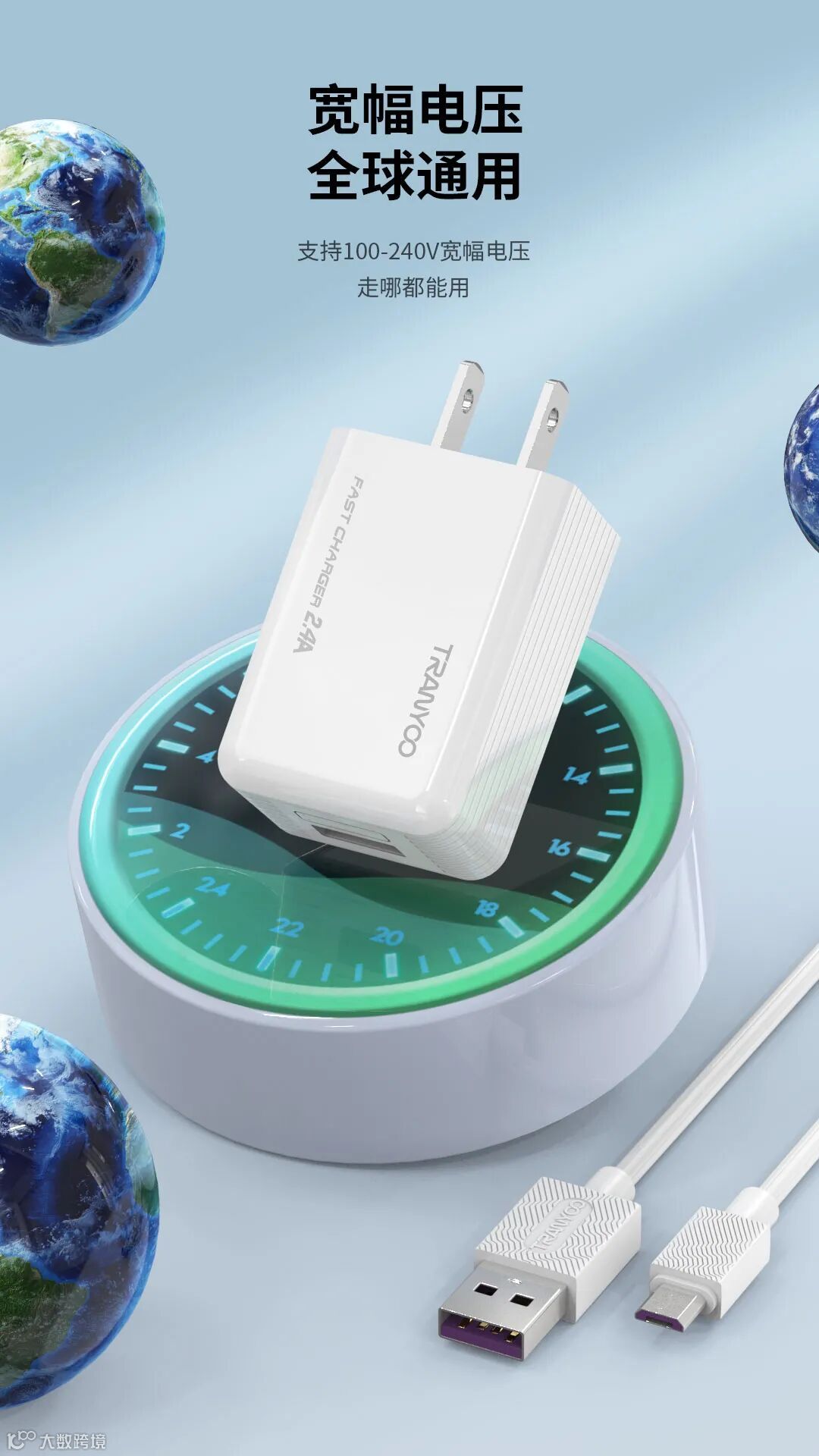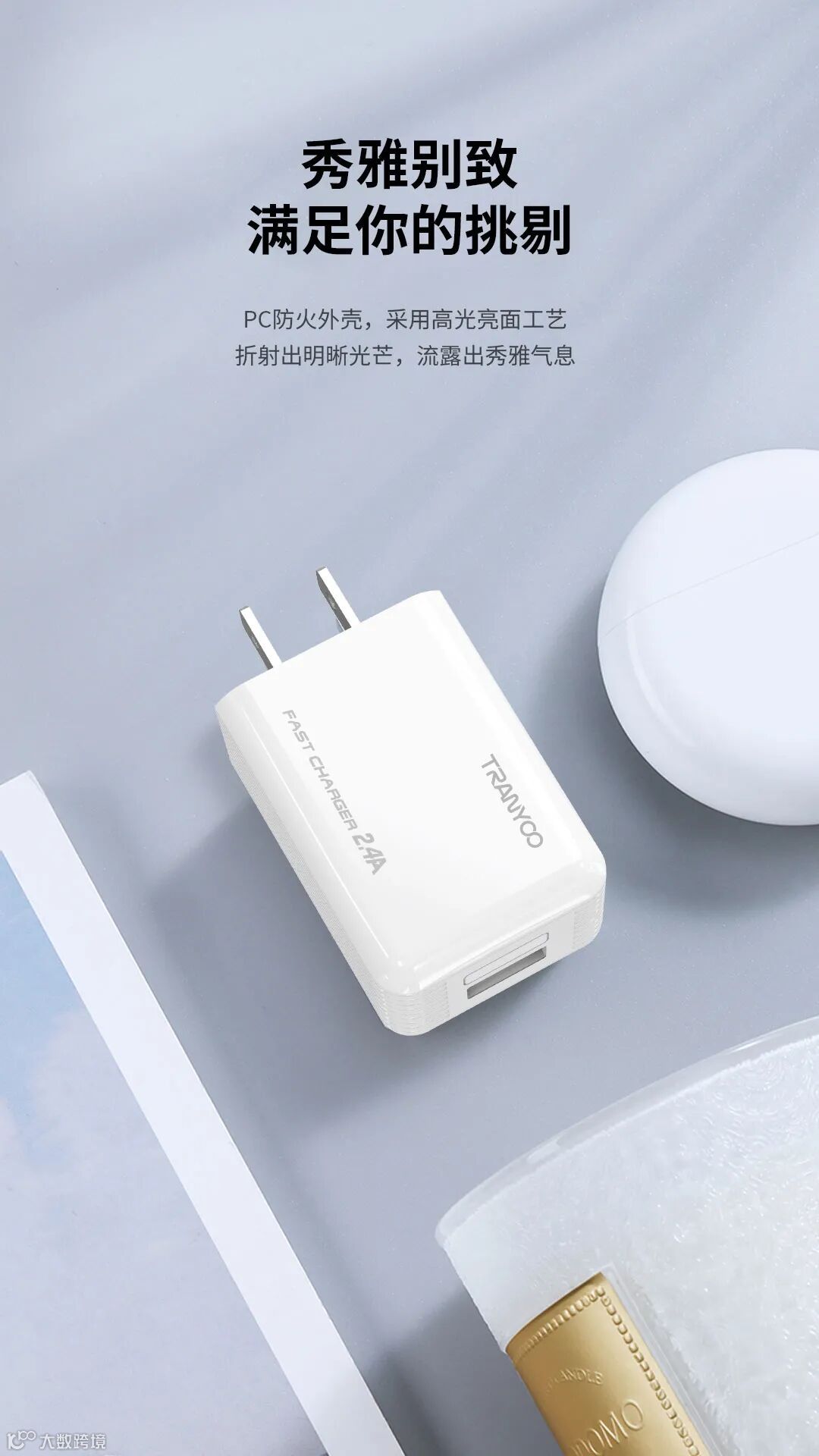 1. 2.4A 大电流,输出持续稳定。2.100-240V 宽幅电压,全球通用。3.采用高光亮面工艺,流露秀雅气息