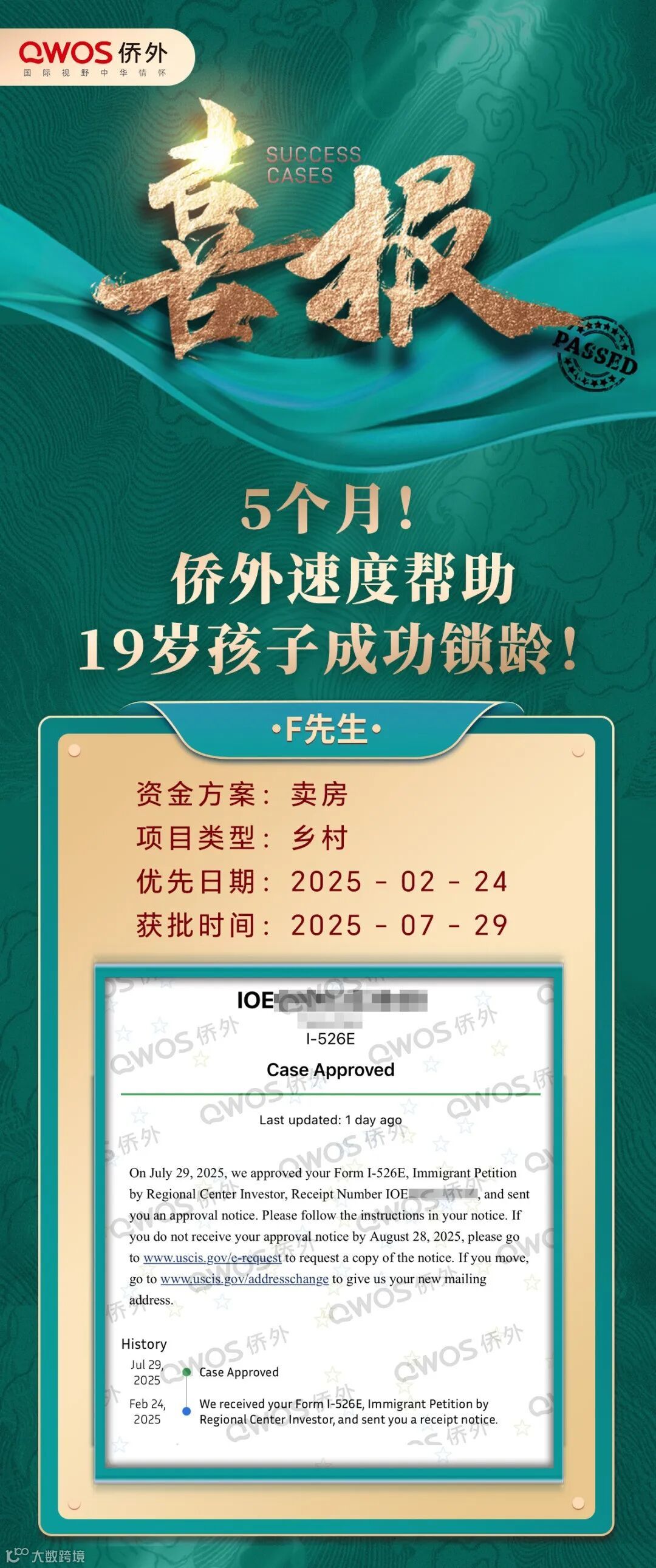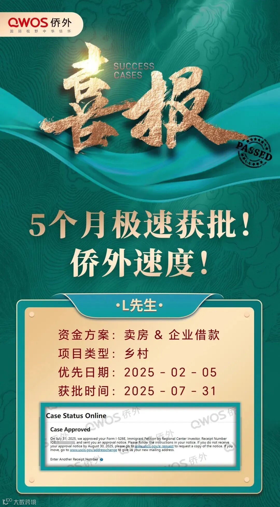 侨外VIP专属服务团队以及实力强劲的文案团队,帮您快速上车,助您2-3个月光速拿下“小绿卡”,快至4个月便能成功获批I-526E——