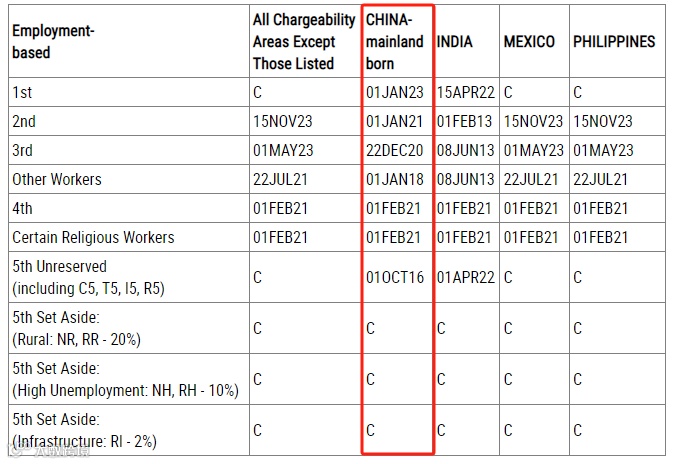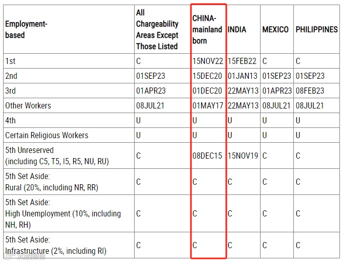 对于中国大陆地区出生的申请人来说,9月EB-1表A排期继续停留在2022年11月15日,表B停留在2023年1月1日无变化。EB-2表A停留在2020年12月15日,表B停留在2021年1月1日。