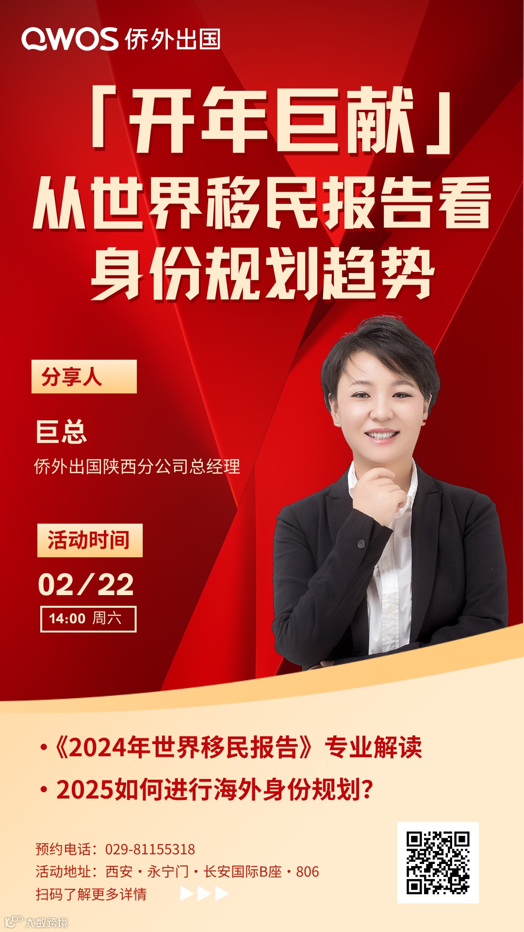 2月22日 中午14:00,侨外出国陕西分公司线下私享会,开年巨献·从世界移民报告看身份规划趋势、从藤校录取看2025年留学趋势,想了解移民留学的朋友们,精彩不容错过,快来锁定活动参与名额吧!