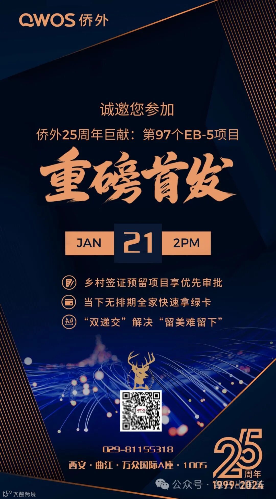 如果您想了解更多美国移民的相关信息,本周日(1月21日),我们将在西安举办“侨外25周年巨献:第97个精品EB-5重磅发布”活动,通过美国行业专家带来一站式移民置业投资项目全解析,欢迎预约到访。↓↓↓