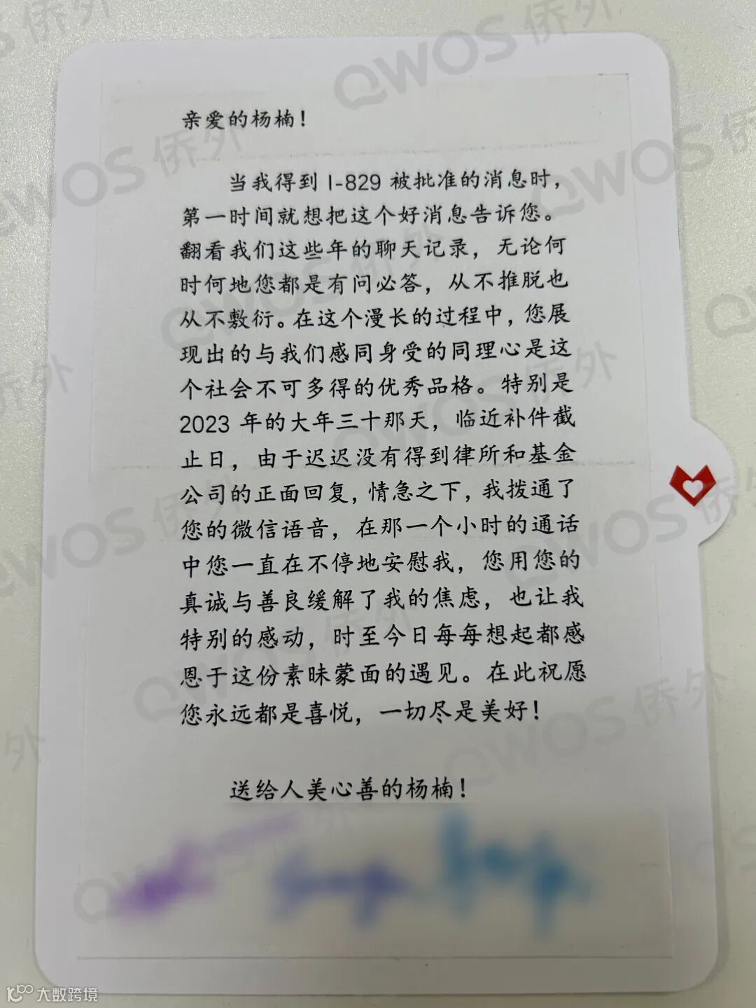 客户给侨外客服的感谢信