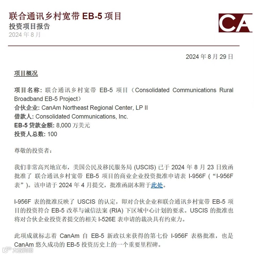最近,侨外出国迎来了一个振奋人心的喜讯——我们携手老牌区域中心CanAm共同推进的联合通讯乡村宽带项目,已经成功获得了美国移民局I-956F批准!