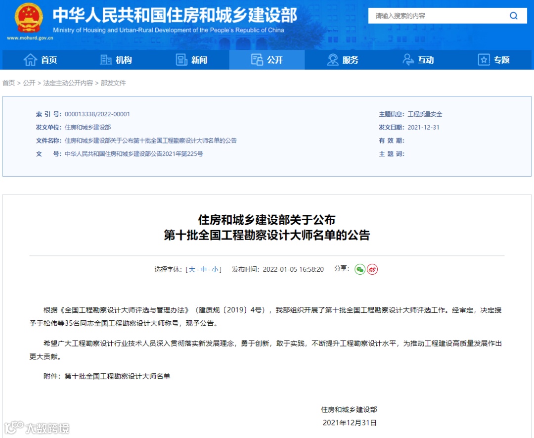 新年伊始,住房和城乡建设部于1月5日发布了《第十批全国工程勘察设计大师名单的公告》,授予于松伟等35名同志全国工程勘察设计大师称号。