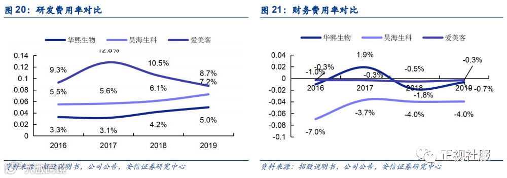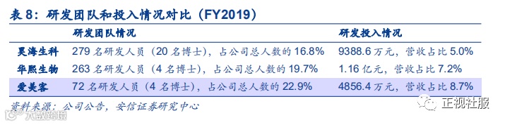 爱美客研发投入占比最高,华熙和昊海研发规模较大。昊海生科深耕医疗领域,研发队伍最强大,研发团队拥有20名博士;华熙研发投入最多,2019年研发投入1.16亿元;爱美客研发费用率为8.7%,为三家中最大。