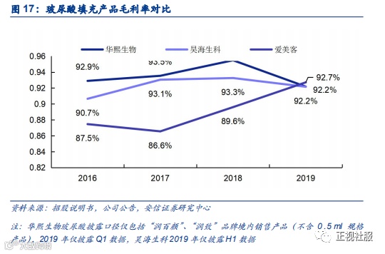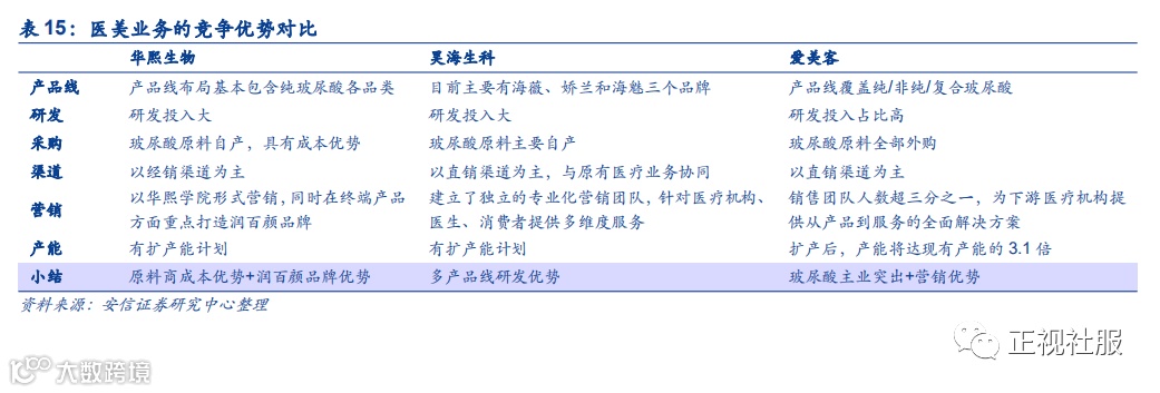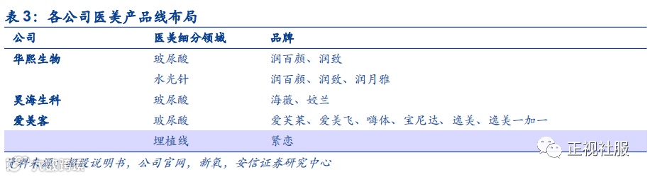 华熙生物的优势在于在纯玻尿酸领域的产品线丰富布局,且业务涉及上中下游,原料自产在成本方面具备优势;爱美客产品线不仅有纯玻尿酸产品,在复合玻尿酸和非纯玻尿酸领域独具风骚,且积极布局埋线和童颜针;昊海生科医美渠道可与其他业务起到一定协同作用,渠道基础更好,也有更多产品线布局。