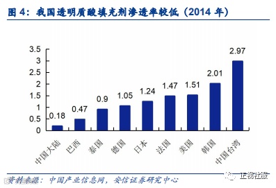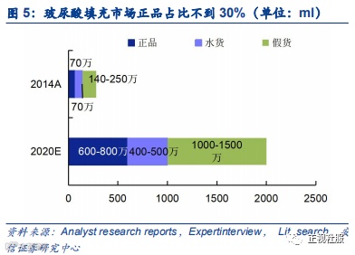 透明质酸填充剂市场规模持续扩大,正品占比不到30%。我国玻尿酸填充市场规模持续扩大,且有较大提升空间。根据弗若斯特沙利文与南方医药经济研究所数据,2014-2018年,我国医美玻尿酸正品市场规模从12.1亿元上升至37.1亿元,CAGR达32.3%。对标海外,我国透明质酸填充项目渗透率较低,提升空间大,根据2014年数据,中国大陆透明质酸填充项目渗透率仅为0.18,低于日本(1.24)、法国(1.47)、美国(1.51)等发达国家及中国台湾(2.97)。此外,目前我国玻尿酸填充行业还不够规范,市场上流通着大量的假货水货,2014年正品、水货和假货市场销量占比分别约25%、25%和50%。随着市场发展趋于成熟,正品市场占比有望扩大,预计2020年占比达30%。
