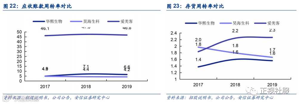 爱美客应收账款周转率和存货周转率均最高,回款质量和运营效率高于同行。昊海生科存货周转率有略微下滑态势,华熙生物营运能力基本稳定。