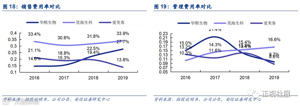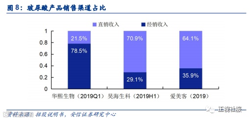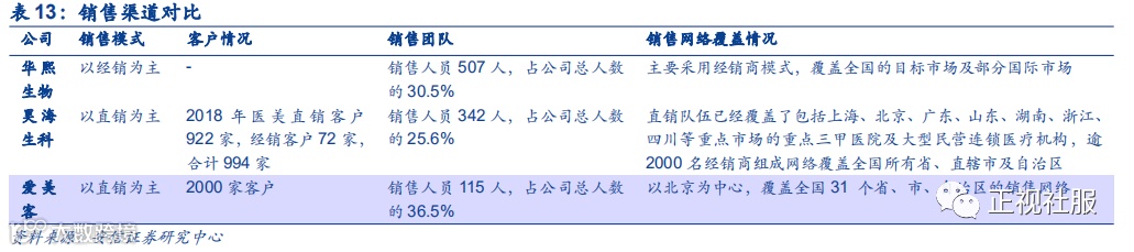 在玻尿酸产品销售方面,华熙生物以经销渠道为主,昊海生科和爱美客则以直销渠道为主。但爱美客的经销占比稳步提升,从2016年的不到20%提升至2019年的36%,带动销售额快速增长。营销方面,华熙生物的营销推广立足于华熙学院,爱美客则提出了为下游医疗机构提供从产品到服务的全面解决方案,营销手段多样化。昊海生物原本眼科、骨科等产品与医美产品渠道方面有一定协同性,资源上具备协同作用。