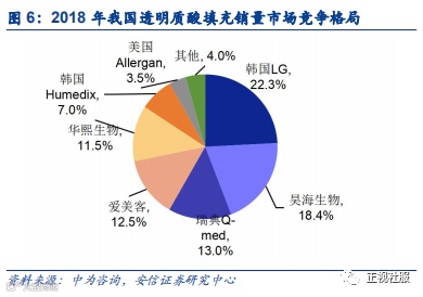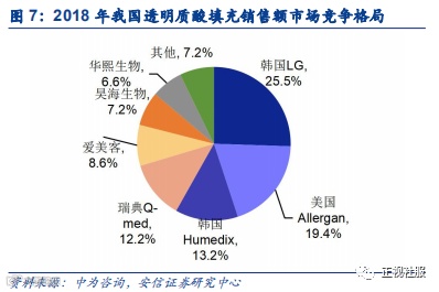 国产头部品牌市场份额相差不大,整体提升空间较大。瑞蓝等进口品牌国内获批较早,加上行业发展初期消费者对产品认知较少,偏爱进口品牌。从2018年市场竞争格局看,韩国LG(旗下“伊婉”品牌)、美国Allergan(乔纳登)、韩国Humedix(旗下“艾莉薇”品牌)、和瑞典med(旗下“瑞蓝”品牌)四家外国厂商占据前四大市场份额,CR4合计占比70.3%。爱美客、昊海生物和华熙生物分别占据8.6%、7.2%和6.6%的市场份额。
