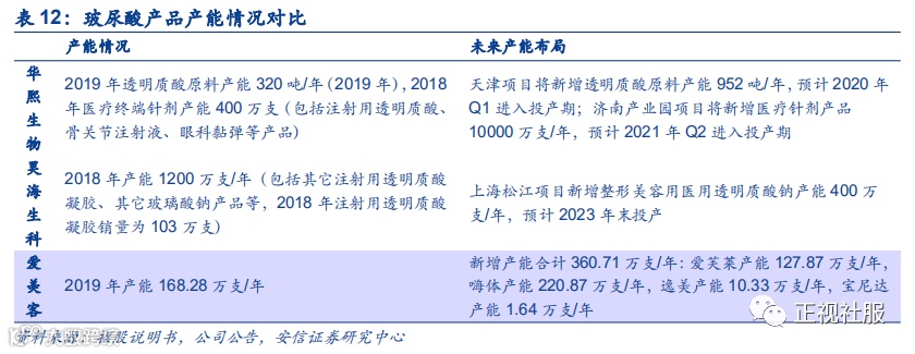 华熙生物和昊海生科针剂类总产能较爱美客更多。三者皆提出了扩产能方案,其中华熙生物的针剂类产能布局最为丰富。