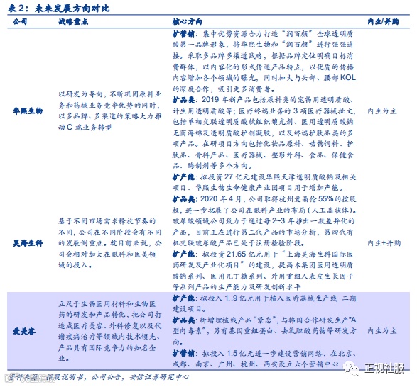 除继续深入研发玻尿酸产品外,三家公司均有扩品类计划。华熙生物与爱美客计划进军肉毒素市场,且二者皆与韩国公司合作,预计在肉毒素领域将产生直接竞争。昊海生科的水光针产品或将与华熙生物水光针产品竞争,此外昊海生科计划沿产业链向下游扩张,或采取收购、投资等方式。爱美客计划推出的手术防粘连产品是昊海生科的传统优势领域。