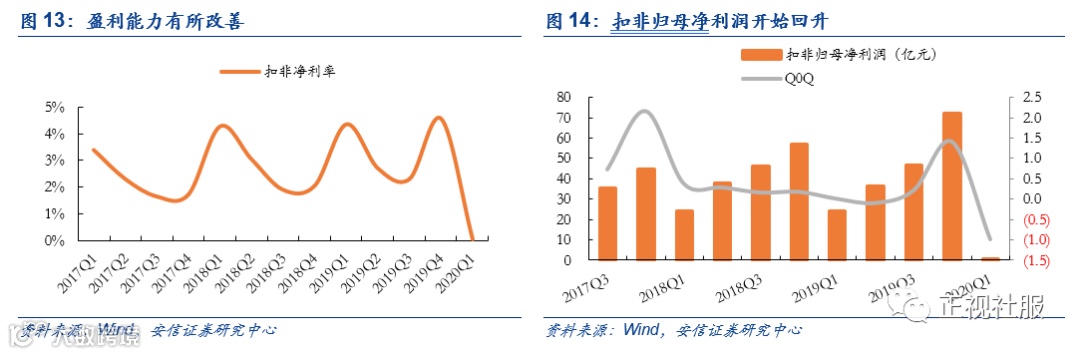 电商:1)苏宁:2019年营收/归母净利/扣非归母净利2692/98/-57亿元,同比+10% / -26%/-1488%,业绩稳定增长,非经常性损益主因苏宁小店等出表和收购物流项目;20Q1实现营收和扣非归母净利578.4/ -5.0亿元,同比-7.07%/+49.49%,疫情影响或有限,期待双线融合优势凸显。2)南极电商:2019全年实现营收39.07亿元/+16.52%,扣非业绩11.48亿元/+36.46%,业绩继续高增长符合预期,经营现金流净额12.55亿元/+127.59%,且拟分红3.86亿元(分红率32.03%),报表质量持续改善;2020Q1营收6.72亿元/-18.51%,扣非归母净利润1.04亿元/-12.97%,虽然受疫情影响导致营收下降,但仍保持利润端增长,根据爬虫数据,在3-4月复工复产后的单月GMV估测分别同比增长28%和25%,并有望继续环比修复。