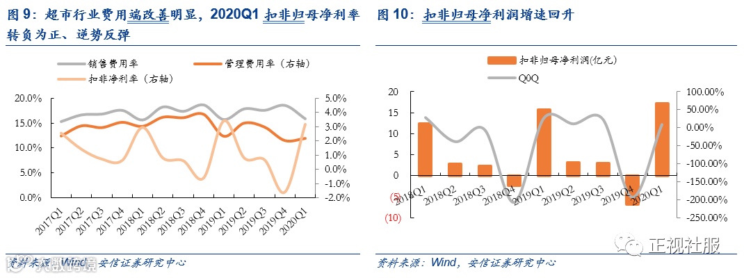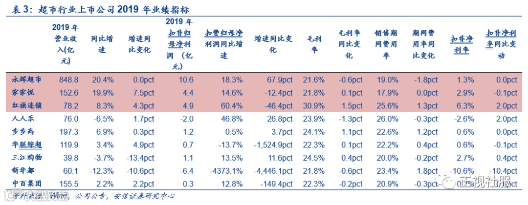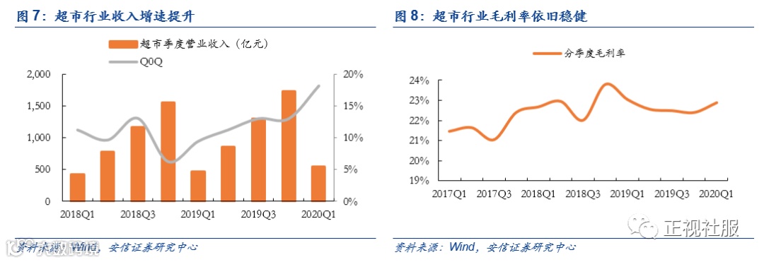 超市:高位CPI推动营收增速提升,毛利率稳健,疫情正向刺激,影响有望持续。超市行业作为必选消费,自2019H2起CPI恒处高位,推动超市行业增速提升:2019年超市行业实现营收1728亿元,同比增长11.6%,增速同比上行1.6pct;毛利率端,整体毛利率水平稳健,增速有所放缓,2019年行业毛利率同比下降0.2pct至22.6%;费用端,费用率整体平稳,控费开始见效,2019年销售费用率为17.4%,同比持平,管理费用率同比下降0.9pct至2.6%,其中龙头永辉股权激励费用大幅下降起到较大影响。单四季度来看,行业承压明显,2019Q4扣非归母净利率为-1.6%,归为负值。2020Q1受疫情正向刺激,超市行业力保民生供应,供应链能力凸显,营收大涨、扣非净利率逆势反弹:2020Q1超市行业营收同比增长18.2%,增速同比上行8.8pct;扣非归母净利率为3.1%,印证行业收入利润高弹性。细分龙头来看:1)永辉超市2019年实现营收/扣非归母净利润848.77亿元/10.61亿元,同比+20.36%/+18.34%;2020Q1实现营收/扣非归母净利润292.57亿元/12.90亿元,同比+31.67%/28.99%,看向二季度,疫情正向影响虽有回落但有望持续;2)家家悦2019年实现营收/扣非归母净利润152.64亿元/4.37亿元,同比+19.90%/14.57%;2020Q1实现营收/扣非归母净利润52.87亿元/1.73亿元,同比+38.96%/+30.97%,业绩超预期。3)红旗连锁2019年实现营收/扣非归母净利润78.23亿元/4.94亿元,同比+8.4%/+60.4%,扣除新网银行投资收益贡献,预计公司主业扣非归母净利润约25-30%;2020Q1实现营收/扣非归母净利润23.45亿元/1.38亿元,同比+24.0%/79.69%,主业利润增速稳健向好。