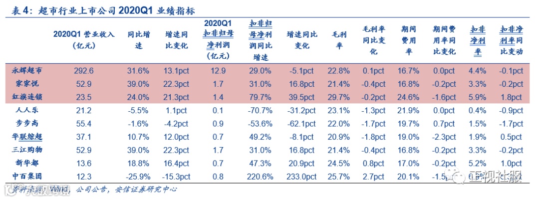 根据公司2020年4月27日公告,红旗连锁2020Q1实现营业利润、归属上市公司股东的净利润、每股收益23.45亿元/+23.96%、1.43亿元/+80.70%、0.11元/+83.33%。
