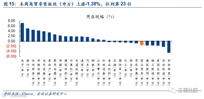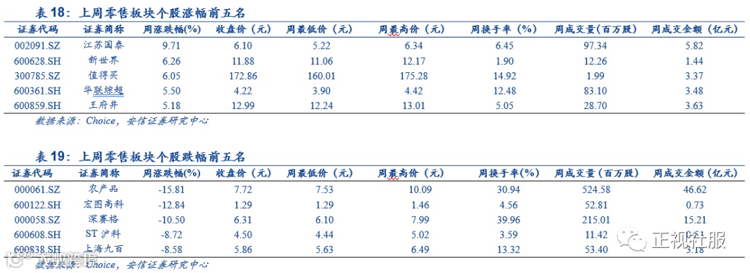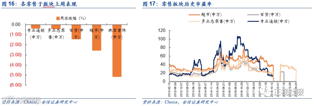 本周(2020.04.27-2020.05.01),商贸零售板块(申万)上涨-1.38%,在申万28个行业中位列第23位,上证综指上涨+1.84%,超额收益-3.22%。分子行业来看,百货、超市、多业态零售、专业连锁、珠宝首饰涨跌幅分别为-1.39%、-2.50%、-0.38%、-0.32%、-5.11%。江苏国泰(+9.71%)、新世界(+6.26%)、值得买(+6.05%)涨幅居前;跌幅前三名分别为:农产品(-15.81%)、宏图高科(-12.84%)、深赛格(-10.50%)。