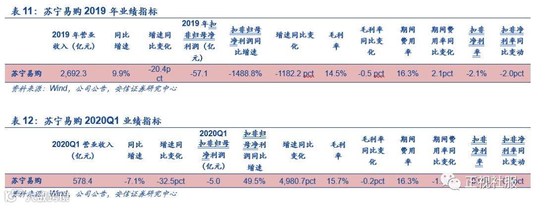苏宁:全年营收稳定增长,2019Q4、2020Q1短期承压,加快布局全渠道智慧零售。苏宁易购2019年营收/归母净利润/扣非归母净利润2692.3/98.4亿元/-57.1亿元,同比+9.91% / -26.2%/-1488.2%,非经常性损益较多主因苏宁小店、苏宁金服和LAOX出表,以及收购佛山、宁波等5个物流项目影响。2020Q1实现营收578.39亿元/-7.07%,归母净利润-5.51亿元/-505.45%,归母扣非净利润-5.00亿元/+49.49%。疫情影响或有限,全场景零售格局初具期待效率进一步提升:①公司已完成家乐福中国并表,家乐福专业的快消品运营经验以及供应链能力,有望与苏宁全场景零售模式、立体物流配送网络以及强大的技术手段进行有机结合,完善在大快消品类的O2O布局,有利于降低采购和物流成本,提升市场竞争力与盈利能力;②零售云加盟店持续扩张,有望依托优势家电品类,强化快消供应链;③公司以智慧零售为核心,一方面以苏宁易购直营店和零售云加盟店为两大抓手深耕低线城市,另一方面以苏宁小店进军便利店市场,并以小店作为物流节点,辐射周围三公里用户群,彻底打通线上与线下流量,有效扩大用户范围,获取粘性流量;收购家乐福后市占率提升,持续整合双线资源规模效应有望进一步显现。④疫情影响下,线上及到家业务有望受到明显催化,家乐福有望实现较快增长;春节及2月线下家电门店销售额占比较低,全年来看受影响程度较小。