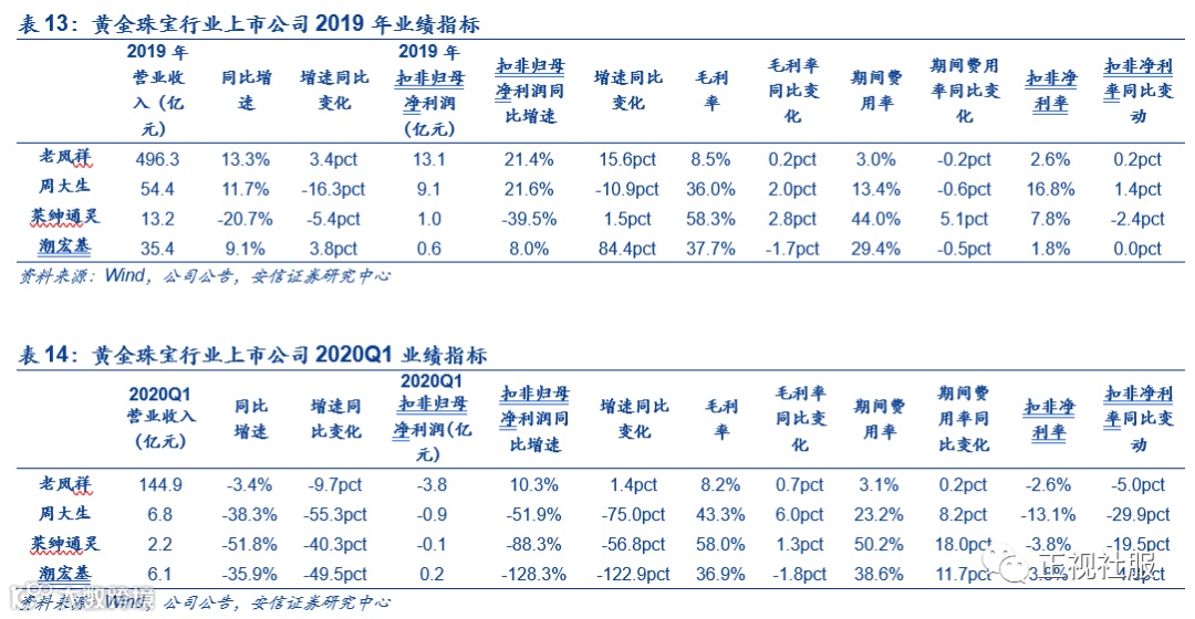 黄金珠宝:收入增速下滑,龙头有所分化。自2019H2起,黄金珠宝需求端持续承压,近期复苏势头显现:1)从社零数据来看,2019年7月开始,限额以上黄金珠宝零售额下滑态势明显(7-12月分别同比-1.6%、-7.0%、-6.6%、-4.5%、-1.1%、3.7%),进入2020Q1,叠加疫情影响,2020年1-2月双月均值、3月同比-41.1%、-30.1%,虽仍处低位,但3月环比上升11.0pct。2)从上市公司数据来看,2019Q4黄金珠宝行业4家上市公司营收增速5.3%,环比增速下降15.1pct;2020Q1受疫情重创,营收同比-8.7%。由于黄金珠宝板块四家公司中,老凤祥体量明显偏大,可能对行业盈利能力统计产生一定影响,故而我们分别看龙头业绩情况,细分龙头业绩分化明显:1)老凤祥业绩稳健增长,疫情影响有限:2019年实现营业收入/扣非归母净利润496.29亿元/13.14亿元,同比+13.35%/+21.39%;2020Q1实现营业收入/扣非归母净利润144.89亿元/3.84亿元,同比-3.44%/+10.33%,随金价上行、疫情催化黄金增值保值需求,业绩有望加速提升。2)周大生展店扩张提速,线上销售发力:2019年门店净增加660家,全年实现营收54.39亿元/+11.69%,扣非归母净利润9.14亿元/+21.59%;2020Q1实现营收6.78亿元/-38.25%,扣非归母净利润1.01亿元/-48.15%,互联网销售在2020年Q1实现营收1.92亿元,同比大增104.32%。3)莱绅通灵则收入、利润继续下滑。