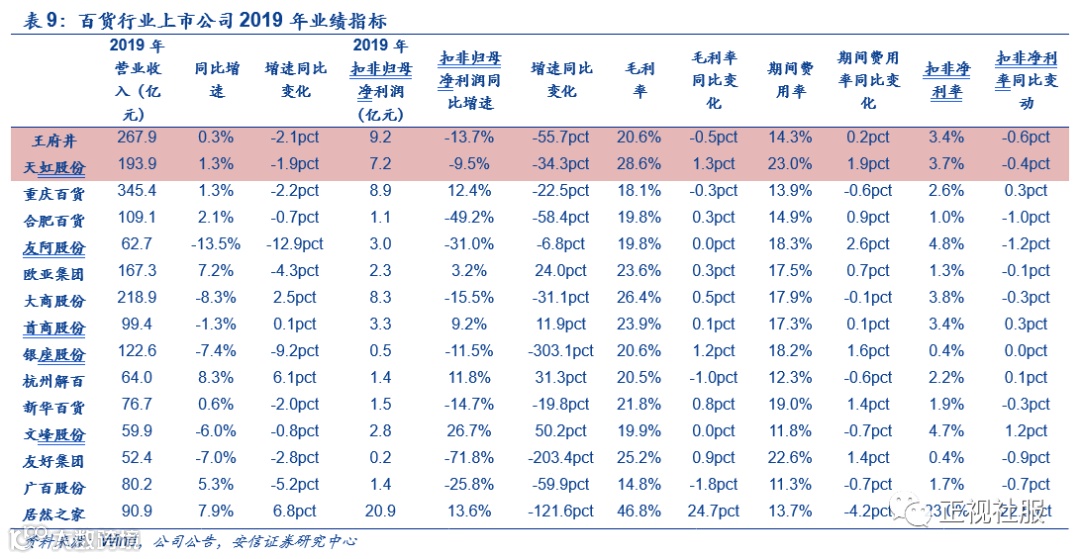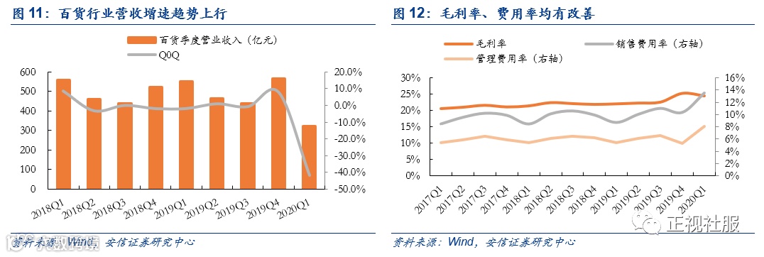 百货:行业整体趋暖,毛利、费用趋势向好,疫情系短期影响,有望迎来消费需求反弹。2019年百货行业整体趋暖:全年实现营收2011亿元,同比增长1.7%,增速同比上升0.7pct;毛利率有所提升,费用管控有所改善,剪刀差继续扩大,2019年行业毛利率+1.2pct至23.0%,销售费用率+0.3pct至10.0%,管理费用率-0.2pct至5.8%,扣非归母净利率同比+0.7pct至3.6%;全年行业扣非归母净利润同比增长27.0%,增速同比下降0.4pct。2020Q1受到疫情重创,营收、利润大幅下滑:百货行业营收同比下降41.6%;毛利率趋势上行+2.5pct至24.4%的前提下,受费用率大幅上升影响(销售费用率+4.7pct至13.5%,管理费用率+2.6pct至8.0%),扣非归母净利率同比-4.3pct至0.0%,2020Q1行业扣非净利润增速-99.7%;随疫情缓解,门店陆续恢复营业,消费需求得到释放,有望持续改善。细分龙头来看:1)天虹股份:2019年实现营收 / 扣非归母净利润193.93/7.17亿元,同比+1.33% / -9.54%;2020Q1实现营收/扣非归母净利润29.97 / 1.00亿元,同比-0.06%/-134.04%(营收同比已剔除新收入准则影响);2)王府井:2019年实现营收/扣非归母净利润267.98/9.20亿元,同比+0.29%/-13.65%;2020Q1实现营收/扣非归母净利润15.20/-1.36亿元,同比-37.79%/-134.46%(营收同比已剔除新收入准则影响)。向后看,考虑后续消费需求释放、同店方面转好,百货龙头业绩有望有所改善。