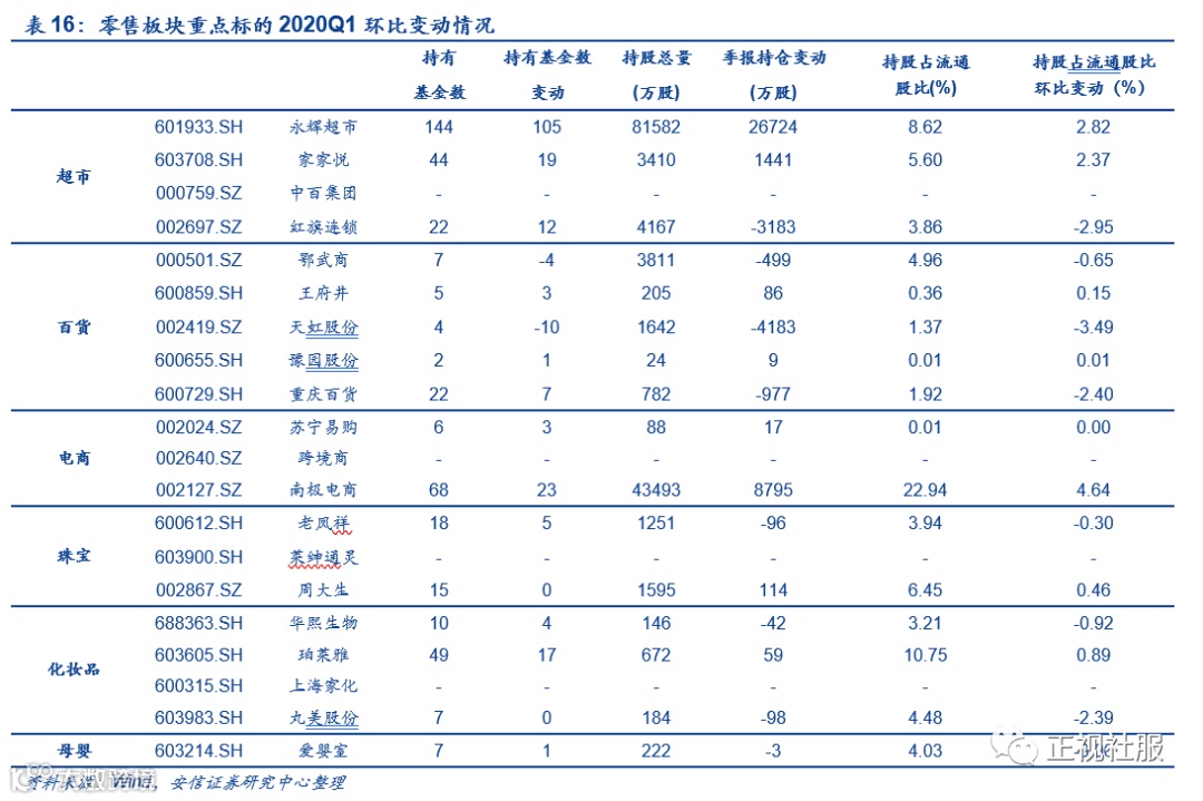可选消费有所调整,王府井、周大生、珀莱雅小幅增持,天虹股份、重庆百货、丸美股份遭遇减持。2020Q1,可选消费板块整体持仓下降,其中:1)百货板块:王府井持仓小幅上涨,持有基金数增加3支至5支,持股总量增加86万股至205万股,持股占流通股比重环比+0.15pct至0.36%,持仓市值增加834万元至2496万元。天虹股份遭遇减持,持有基金数减少10支至4支,持股总量减少4183万股至1642万股,持股占流通股比重环比-3.49pct至1.37%,持仓市值减少4.7亿元至1.5亿元;重庆百货持仓下降,持有基金数减少7支至22支,持股总量减少977万股至782万股,持股占流通股比重环比-2.40pct至1.92%,持仓市值减少3.1亿元至2.2亿元;鄂武商持仓下降,持有基金数减少4支至7支,持股总量减少499万股至3811万股,持股占流通股比重环比-0.65pct至4.96%,持仓市值减少1.3亿元至4.4亿元。2)黄金珠宝板块:老凤祥持仓小幅下降,持有基金数增加5支至18支,但持仓总量减少96万股至1251万股,持股占流通股比重环比-0.30pct至3.94%,持仓市值下降1.4亿元至5.0亿元;周大生持有基金数保持不变为15支,持仓总量增加114万股至1595万股,持股占流通股比重环比+0.46pct至6.45%,持仓市值增加1022万元至2.9亿元。3)化妆品板块:珀莱雅持有基金数增加17支至49支,持股总量增加59万股至672万股,持股占流通股比重环比+0.89pct至10.75%,持仓市值增加2.3亿元至7.7亿元;丸美股份遭遇减持,持有基金数保持不变为7支,持股总量减少98万股至184万股,持股占流通股比重环比-2.39pct至4.48%,持仓市值减少4196万元至1.3亿元;华熙生物持有基金数增加4支至10支,持股总量减少42万股至146万股,持股占流通股比重环比-0.92pct至3.21%,持仓市值减少4544万元至1.1亿元。