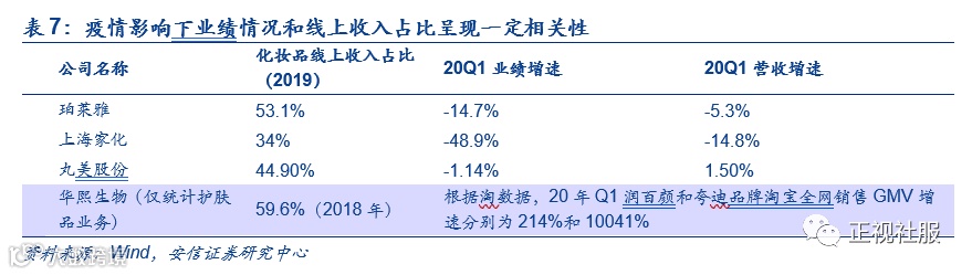 因此,线上营收占比较高的企业受疫情影响相对较小,华熙生物、珀莱雅和丸美护肤品板块线上收入占比较高(分别为90%+、53.1%和44.9%),一季度业绩和营收增速受疫情影响较小。