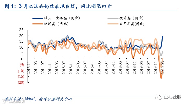 分品类看,大部分品类环比向好。其中:1)必选消费仍然表现良好。2020年3月限额以上粮油食品、日用品、饮料、烟酒同比增长19.2%、0.3%、6.3%、-9.4%,环比1-2月前值分别+9.5pct、6.9pct、3.2pct、6.3pct,既为疫情影响下必选消费作为刚需仍然维持较好增长的印证,也说明从品类来讲,消费者必选消费商品结构可能逐步回归;2)可选方面,同比虽仍为下降,但环比降幅收窄。2020年3月限额以上化妆品、黄金珠宝同比增长-11.6%、-30.1%,增速相对1-2月前值+2.5pct、+11.0pct;限额以上家电、家具同比增长-29.7%、-22.7%,增速相对1-2月前值+0.3pct、+10.8pct,虽然需求及安装均受疫情影响有所滞后,但环比向好;限额以上文具同比增长-22.7%,增速相比1-2月前值+15.0pct,或与企业渐开工、学生需求渐回暖相关。3)此外,3月限额以上中西药品同比增长8.0%,增速相对前值+7.8pct。