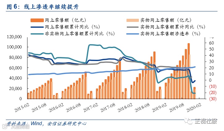 乡村略好于城镇,餐饮影响大于零售,线上渗透率反常提升。分区域来看,乡村影响略好于城镇,2020年1-2月城镇消费品零售额为44881亿元,同比下降20.7%(增速环比-28.5pct);乡村消费品零售额7249亿元,同比下降19.0%(增速环比-28.1pct)。分类型来看,餐饮影响大于商品零售:2020年1-2月商品零售47936亿元,同比增长-17.6%(环比-25.5pct);餐饮收入4194亿元,同比下降43.1%(环比-52.2pct)。分渠道来看,实物商品网上零售额2020年1-2月增速为同比上升3.0%,不降反增;且网上零售额渗透率为21.5%,2019年9-12月渗透率分别为19.5%、19.5%、20.4%、20.7%,一反以往春节月度线上淡季趋势,逆势提升;其中在实物商品网上零售额中,吃类和用类商品分别增长26.4%和7.5%,穿类商品下降18.1%,印证此前我们对于此次“宅经济”中消费品线上购买的变化判断。