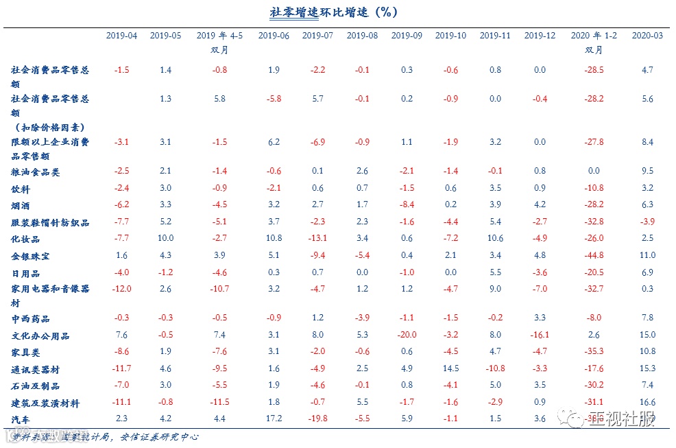 3月社零同比增速-15.8%,降幅环比收窄。据国家统计局及Wind数据,2020年3月,社会消费品零售总额26450亿元,同比下降15.8%,扣除价格因素实际增速-18.1%;排除汽车因素,汽车以外的消费品零售额23841亿元,下降15.6%。价上来看,3月CPI同比上涨4.3%,虽有回落但仍处高位;整体来看,疫情影响虽尚未消除,但3月社零降幅环比收窄向好。