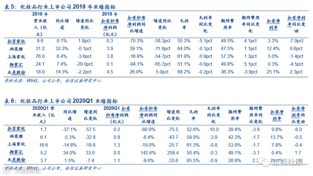 1)2019Q4利润端略微承压,发力线上驱动业绩快增。2019年化妆品上市公司共实现营收159亿元,同比增长11.3%;其中2019Q1、2019Q2、2019Q3、2019Q4分别为9.4%、9.2%、8.9%、16.9%,单四季度扣非净利润同比下降47.3%;2020Q1,化妆品上市公司实现营收33亿元,同比下降7.9%,主要系疫情影响线下渠道销售大幅缩减所致(由于华熙生物2019年11月上市,壹网壹创2019年9月上市,行业统计只包含其他五家)。与黄金珠宝板块类似,由于化妆品板块公司较少,且权重有所不同,我们直接对龙头公司层面进行盈利能力分析,其中:1)珀莱雅2019年实现营收31.24 亿元/+32.3%,扣非归母净利润3.86亿元/+39.07%,其中线下增速维稳(+9.82%),线上持续高增(+60.97%);2020Q1实现营收6.08亿元/-5.25%,扣非归母净利润0.83亿元/-8.36%,疫情催化线上渠道,公司预计Q1线上收入增速高于30%;2)上海家化2019年实现营收75.97亿元/+6.43%;扣非归母净利润3.79亿/-16.91%;2020Q1实现营收16.65亿元/-14.8%,扣非归母净利润1.3亿/-19.0%,潘秋生新任公司CEO兼总经理,引领公司转型步伐,看好新锐品牌持续高增,静待营销创新+线上转型效果显现。3)华熙生物2019年实现营收18.86亿元/+49.28%;归母扣非净利5.67亿元/+35.2%,营收业绩高增符合预期,医疗及护肤品业务表现出色;2020Q1实现营收3.68亿元/+3.5%,归母扣非净利9401万元/-13.56%,受疫情影响有限,公司新品牌放量显著。4)丸美股份2019年实现营收18.01亿元/+14.28%,归母扣非净利4.51亿元/+25.95%,业绩基本符合预期;2020Q1,丸美股份实现营收3.7亿元/+1.5%,归母扣非净利1.08亿元/-9.6%,公司线上占比逐步提升,边际有望迎来大幅改善,且短期受疫情影响有限。5)壹网壹创2019年实现营收14.51亿元/+43.2%,归母扣非净利2.02亿元/+33.3%;2020Q1实现营收2.14亿元/-7.8%,归母扣非净利4505万元/+39.8%,立足优质营销传播、数据挖掘及产品孵化能力,扩品牌+扩品类+扩平台三向发力下空间广阔。