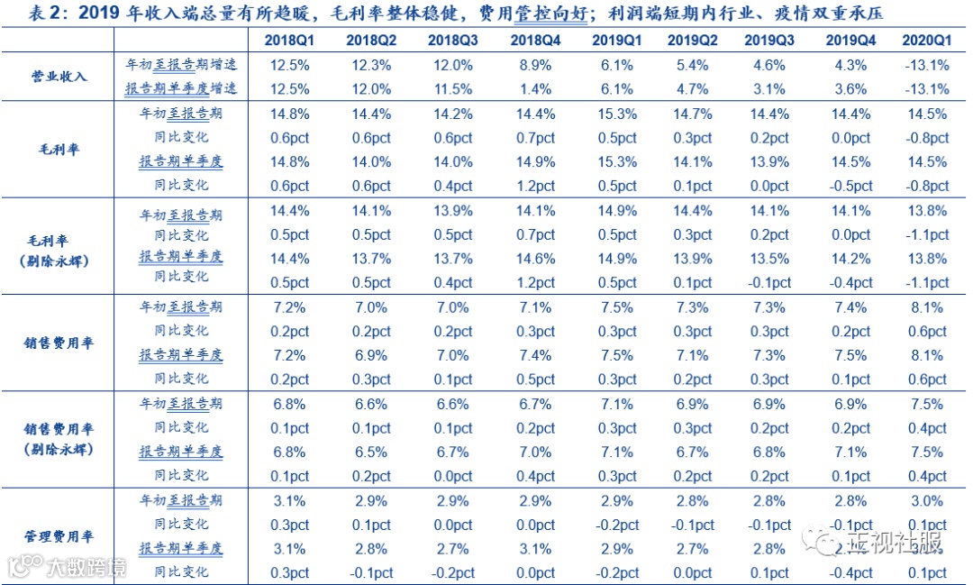 化妆品:线下冲击明显,线上驱动行业增长。1)2019年板块整体稳增,Q4业绩承压。化妆品板块实现营收159亿元/+11.3%,扣非净利12.6亿元/-4%,毛利率61.0%/-0.7pct,受销售、管理费用增加影响(销售费用率40.4%/+1.6pct,管理费用率微增9.0%/+0.4pct),扣非净利率下降1.3pct至7.9%。分季度看,19Q1-20Q1营收增速分别为9.4%/9.2%/8.9%/16.9%/-7.9%,扣非净利增速为7%/140%/6%/-47%/-17%,其中Q4受上海家化和拉芳家化业绩承压影响,Q1主要系疫情对线下渠道冲击。2)线上驱动行业增长,不同品类受疫情影响有异。19年珀莱雅/丸美/上海家化线上渠道增速达61%/23%/30%,华熙生物护肤品营收增速118%主要由线上带动,华熙生物、珀莱雅和丸美护肤品线上收入占比较高(分别为90%+/53.1%/44.9%),受疫情影响相对较小。品类方面彩妆受冲击较为明显,消杀类产品增长迅速;3)营运能力方面,品牌为应对疫情影响加大备货,20Q1珀莱雅/上海家化/丸美/华熙生物存货周转天数同比19Q1增加24/25/29/138天,为激励经销商进货应收账款周转天数也有所延长。4)短期化妆品龙头受影响有限,珀莱雅线上打法成熟、20年主推红宝石+双抗精华有望持续高增;上海家化探索线上转型且新任CEO卓具经验、20年重点发力佰草集和玉泽品牌;丸美对线上重视程度提升;华熙生物护肤品多品牌齐发+线上为主,在未来发力营销+新品发力下期待打开成长空间。疫情影响下化妆品行业整体线上转型,壹网壹创有望受益。