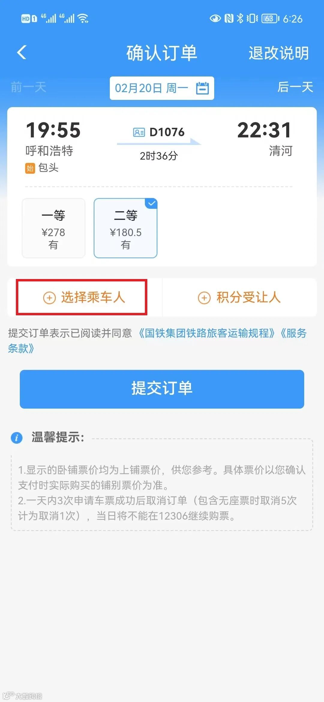 选定车次后进入预定页面,点击“选择乘车人”即可。
