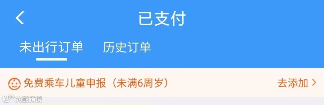 购买成年人旅客的车票后,在“订单”中选择“已支付”或“本人车票”,点击顶端出现提示中的“去添加”,勾选需携带免费乘车儿童的成年人旅客信息,点击“添加免费乘车儿童”后“确认”,即为完成。