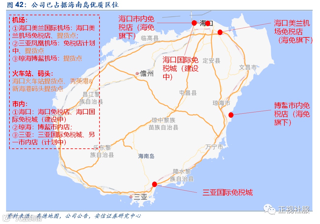 目前海南共海口美兰国际机场、三亚凤凰机场和琼海博鳌机场3个机场,公司在美兰机场设有免税店,三亚凤凰机场免税店已在计划中。同时三家机场均设有提货点,海口市秀英港、新港和火车站也设有提货点,和海口、三亚和琼海3市3家已建成市内免税店相互配合。未来三亚市内计划再增加一家免税店,海口国际免税城建设中,先发卡位优势进一步强化。