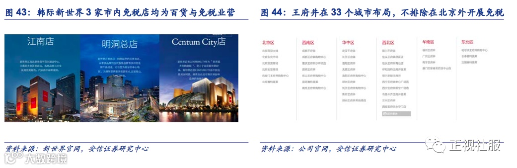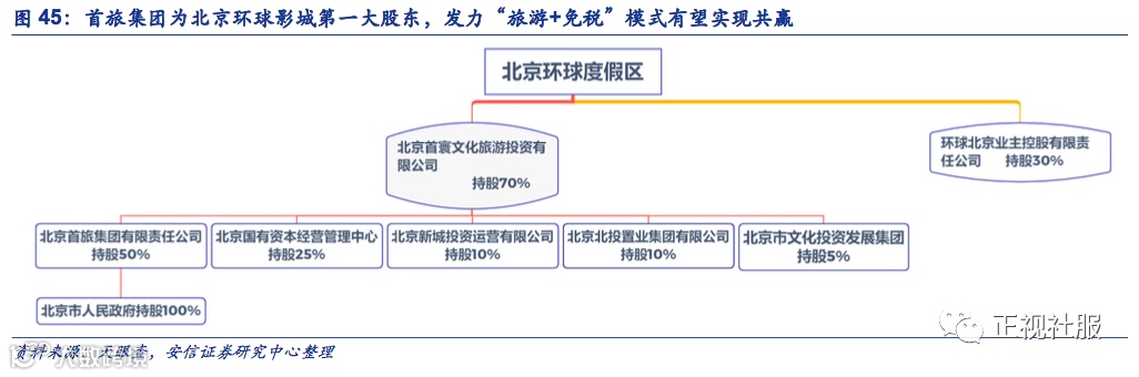 北京环球影城或有望打造“旅游+免税”模式,借助首旅集团资源+免税牌照加持,王府井或有望实现市内店入驻实现共赢。1)根据北京青年报此前的新闻报告,首旅集团董事长段强在2016年3月的采访中表示,环球影城内将设三座主题公园,分别为好莱坞主题、中国主题及一座水上乐园,还将同期建设6座至7座酒店,以及在环球影城的购物区域内不排除将引入免税店,打造一个集观光、休闲、度假、购物为一体的旅游综合体。此外,根据新京报的新闻,北京市政协调研组在2019年6月也同样提出建议,争取国家层面支持,制定京津冀区域出境旅游居民享受在京购买一定额度的免税商品政策,引导境外消费回流;并加强市内免税站等业态布局,前期可利用现有国有零售百货店先行先试,逐步扩大市内免税店布点;并建议充分利用保税区的相关政策,在环球影城主题公园等重点区域规划建设2-3个一体化的进口商品展销中心,引导境外消费回流。2)从北京环球影城的股权结构来看,首旅集团通过持股北京首寰文旅公司50%的股权,间接持股北京环球影城总股本的35%,为第一大持股股东。叠加本次王府井获得免税品经营资质,且为首旅集团体系内最大的百货零售类公司,我们认为未来或不排除让王府井在环球影城的购物区域开展市内免税店的可能性;再从环球影城的客流性质+旅游人次+商业模式来看,未来王府井若有望实现市内免税店进驻环球影城,未来发展潜力可期。